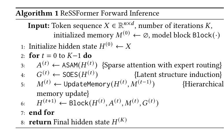 虽然Transformer架构在各个领域表现出了令人印象深刻的可扩展性,但它们仍然面临着长上下文推理、计算效率和结构泛化方面的挑战,这主要是因为它们存在刚性层堆叠、密集注意力和依赖位置编码的问题。我们提出了ReSSFormer,这是一种递归稀疏结构Transformer,集成了三种互补的创新:用于具有有限深度的迭代推理的循环推理与内存单元(R2MU)、用于高效和有针对性的上下文选择的自适应稀疏注意力模块(ASAM)以及用于无位置结构归纳的自我组织编码器结构(SOES)。ReSSFormer用递归推理替代了传统的深度堆叠,用令牌和专家级的稀疏性替代了全注意力,并直接从内容中建模潜在令牌拓扑。在语言建模、多跳问答和结构敏感任务中,ReSSFormer在可比的FLOPs和参数预算下始终优于强大的基准测试,突显了其可扩展性、效率和结构灵活性。