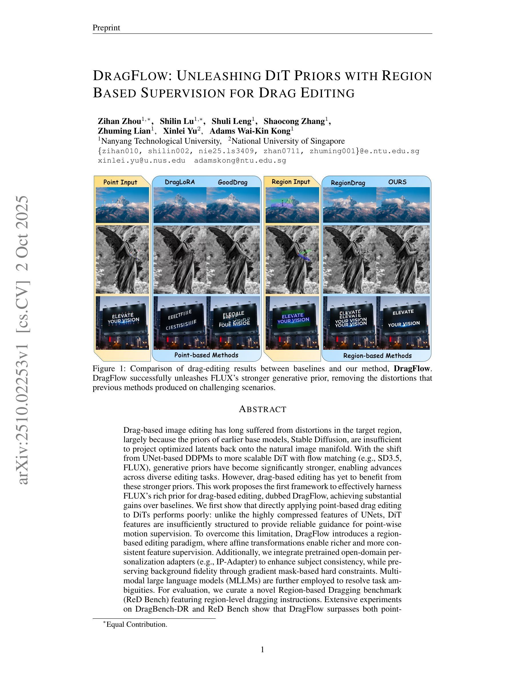 基于拖放的图像编辑长期存在目标区域失真的问题,这主要是因为早期基础模型(如Stable Diffusion)的先验知识不足以将优化后的潜在变量投影回自然图像流形。随着从基于UNet的DDPMs转向更可扩展的DiT流匹配(例如SD3.5、FLUX),生成先验知识变得更为强大,能够在各种编辑任务中取得进展。然而,基于拖放的图像编辑尚未从这些更强的先验知识中受益。这项工作提出了第一个有效利用FLUX丰富先验知识的基于拖放的编辑框架,名为DragFlow,相较于基线方法取得了显著的提升。