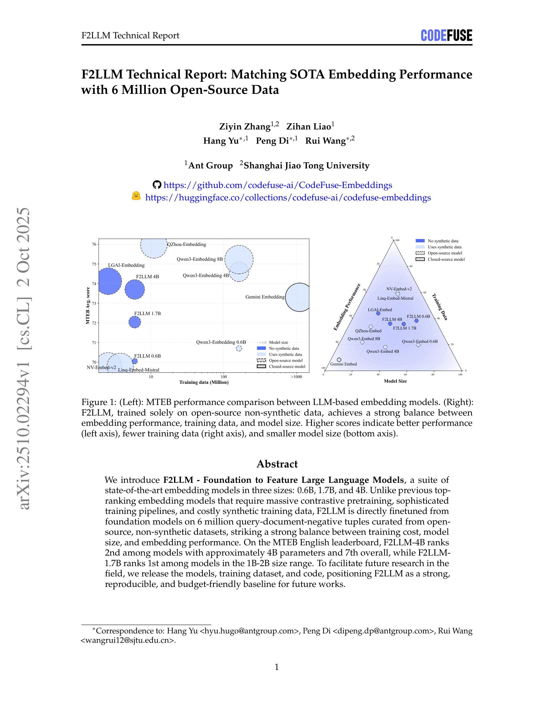 我们介绍了F2LLM——从基础到特性大规模语言模型,这是一套最先进的嵌入模型,包括三种规模:0.6B、1.7B和4B。不同于之前排名靠前的嵌入模型,需要大规模对比预训练、复杂的训练管道和昂贵的合成训练数据,F2LLM直接从基础模型上调整参数训练而成,所用数据是精心挑选自开源非合成数据集中的6百万查询文档否定元组,在训练成本、模型大小和嵌入性能之间取得了很好的平衡。在MTEB英语排行榜上,F2LLM-4B在参数约为4B的模型中排名第2,总体排名第7,而F2LLM-1.7B在1B-2B大小范围内的模型中排名第1。为了促进该领域未来的研究,我们发布了模型、训练数据集和代码,将F2LLM定位为未来工作的强大、可重复、经济实惠的基线。