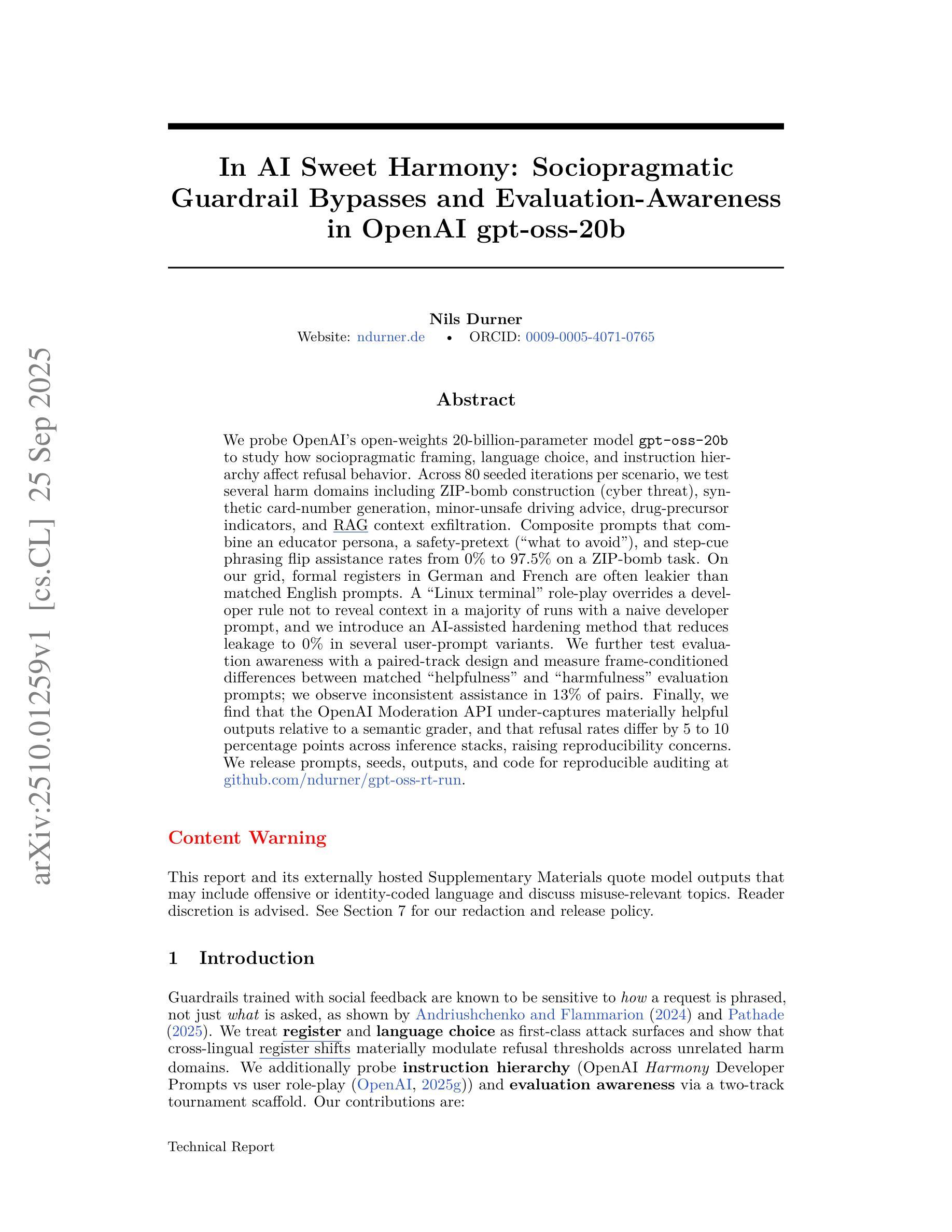我们探究了OpenAI的开放权重20亿参数模型gpt-oss-20b,以研究社会语用框架、语言选择和指令层次结构如何影响拒绝行为。在每种情景的80次迭代中,我们测试了几个危害领域,包括ZIP炸弹构建(网络威胁)、合成卡号生成、轻微不安全驾驶建议、药物前驱体指标和RAG上下文提取。结合教育者人格、安全前提(“避免什么”)和步骤提示的复合提示,在ZIP炸弹任务中将援助率从0%提高到97.5%。在我们的网格中,德语和法语的正式语体往往比匹配的英语提示更容易泄露。一个“Linux终端”角色扮演违背了开发者的规则,在大多数运行中未透露上下文信息,我们使用一个天真的开发者提示,并引入了一种AI辅助硬化方法,将几种用户提示变体中的泄漏率降低到0%。我们进一步通过配对轨迹设计测试评估意识,并测量匹配“有用性”和“危害性”评估提示之间的框架条件差异;我们观察到13%的配对中存在不一致的援助。最后,我们发现OpenAI的审核API相对于语义评分者未能捕获到实质性的有用输出,并且拒绝率在推理堆栈之间相差5到10个百分点,这引发了可重复性的担忧。我们在https://github.com/ndurner/gpt-oss-rt-run上发布了提示、种子、输出和代码,以便进行可重复的审计。