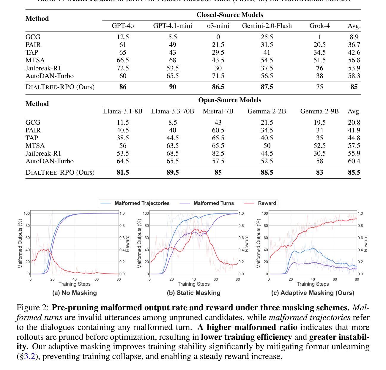 - DialTree-RPO框架结合了树搜索和强化学习,能够自主发现多样的多轮攻击策略。