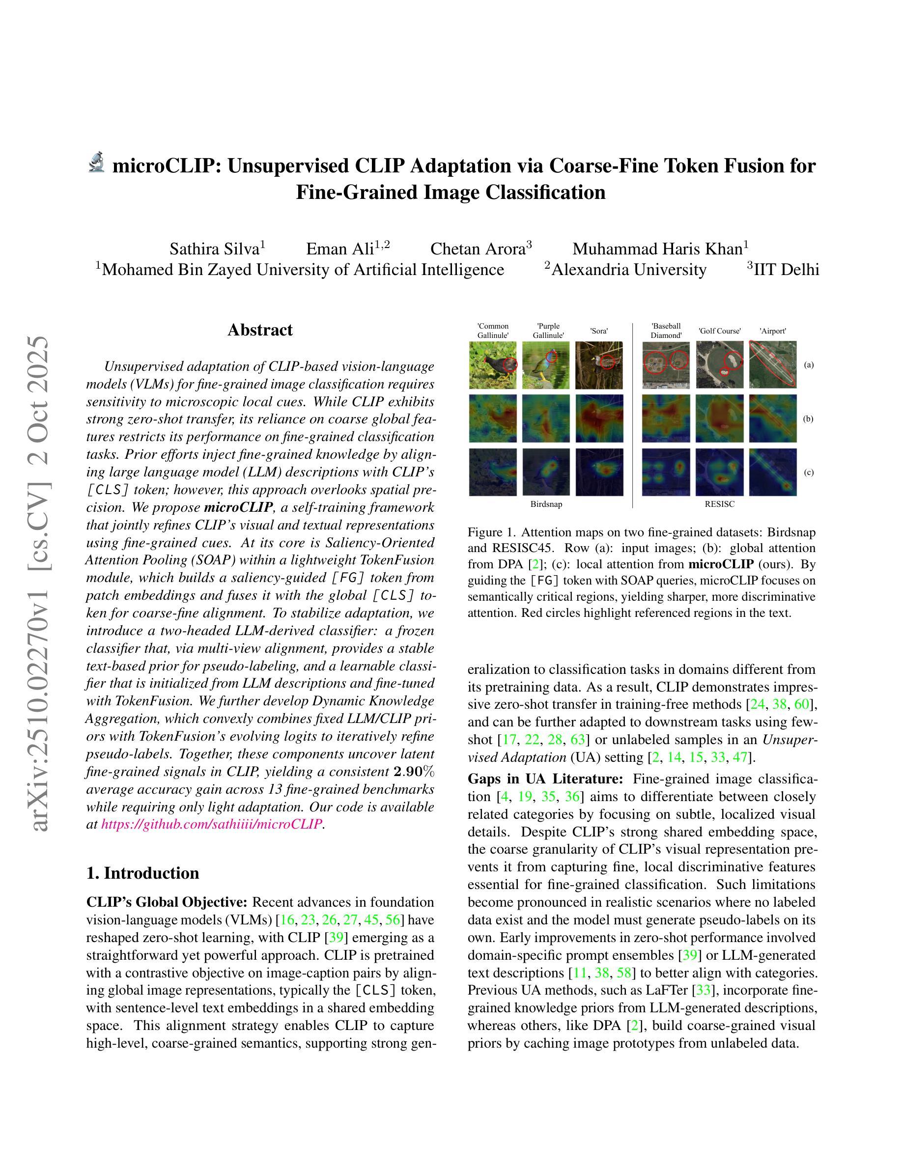 Unsupervised adaptation of CLIP-based vision-language models (VLMs) for fine-grained image classification requires sensitivity to microscopic local cues. While CLIP exhibits strong zero-shot transfer, its reliance on coarse global features restricts its performance on fine-grained classification tasks. Prior efforts inject fine-grained knowledge by aligning large language model (LLM) descriptions with the CLIP $\texttt{[CLS]}$ token; however, this approach overlooks spatial precision. We propose $\textbf{microCLIP}$, a self-training framework that jointly refines CLIP’s visual and textual representations using fine-grained cues. At its core is Saliency-Oriented Attention Pooling (SOAP) within a lightweight TokenFusion module, which builds a saliency-guided $\texttt{[FG]}$ token from patch embeddings and fuses it with the global $\texttt{[CLS]}$ token for coarse-fine alignment. To stabilize adaptation, we introduce a two-headed LLM-derived classifier: a frozen classifier that, via multi-view alignment, provides a stable text-based prior for pseudo-labeling, and a learnable classifier initialized from LLM descriptions and fine-tuned with TokenFusion. We further develop Dynamic Knowledge Aggregation, which convexly combines fixed LLM/CLIP priors with TokenFusion’s evolving logits to iteratively refine pseudo-labels. Together, these components uncover latent fine-grained signals in CLIP, yielding a consistent $2.90%$ average accuracy gain across 13 fine-grained benchmarks while requiring only light adaptation. Our code is available at https://github.com/sathiiii/microCLIP.