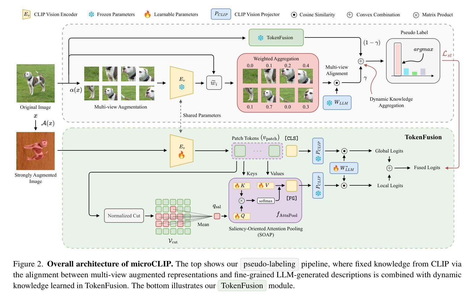 基于CLIP的视觉语言模型(VLMs)的无监督适应对于精细图像分类需要敏感于微观局部线索。虽然CLIP表现出强大的零样本迁移能力,但它对粗糙全局特征的依赖限制了其在精细分类任务上的性能。之前的努力通过将与大型语言模型(LLM)的描述对齐来注入精细知识,这忽略了空间精度。我们提出了microCLIP,这是一个自训练框架,它通过利用精细的线索来共同完善CLIP的视觉和文本表示。其核心是轻量级的TokenFusion模块中的显著性导向注意力池化(SOAP),该模块从补丁嵌入中构建了一个显著性引导的[FG]标记,并将其与全局[CLS]标记融合,以实现粗对齐和精细对齐。为了稳定适应过程,我们引入了双重LLM派生分类器:一个冻结分类器通过多视图对齐为伪标签提供稳定的文本基础先验,一个可学习分类器从LLM描述初始化并在TokenFusion中进行微调。我们还开发了动态知识聚合,它通过凸组合固定的LLM/CLIP先验和TokenFusion不断发展的对数几率来迭代地改进伪标签。这些组件共同作用,揭示了CLIP中的潜在精细信号,在13个精细分类基准测试中实现了平均准确度提高2.90%,而仅需要轻量级的适应。我们的代码可以在以下网站找到:https://github.com/sathiiii/microCLIP。