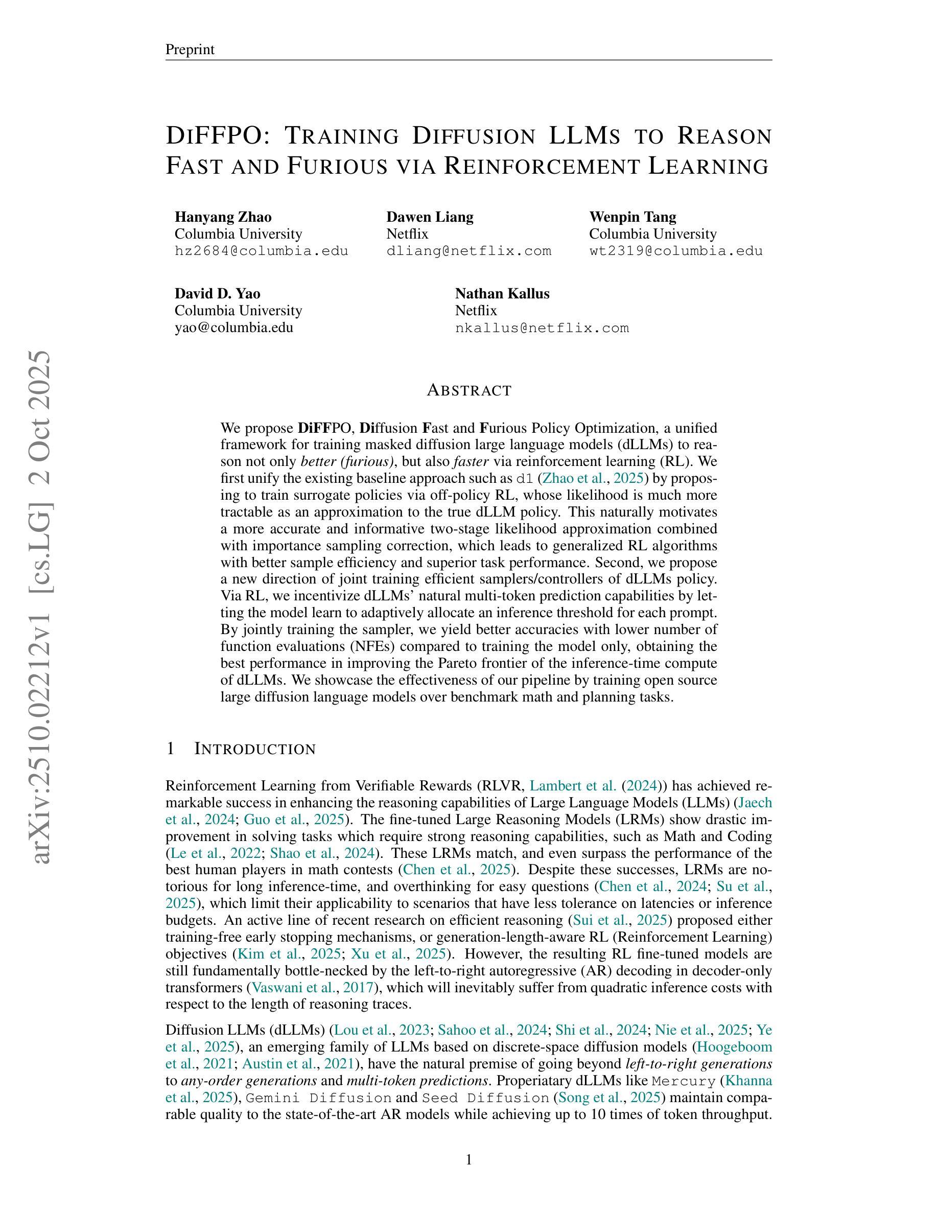 We propose DiFFPO, Diffusion Fast and Furious Policy Optimization, a unified framework for training masked diffusion large language models (dLLMs) to reason not only better (furious), but also faster via reinforcement learning (RL). We first unify the existing baseline approach such as d1 by proposing to train surrogate policies via off-policy RL, whose likelihood is much more tractable as an approximation to the true dLLM policy. This naturally motivates a more accurate and informative two-stage likelihood approximation combined with importance sampling correction, which leads to generalized RL algorithms with better sample efficiency and superior task performance. Second, we propose a new direction of joint training efficient samplers/controllers of dLLMs policy. Via RL, we incentivize dLLMs’ natural multi-token prediction capabilities by letting the model learn to adaptively allocate an inference threshold for each prompt. By jointly training the sampler, we yield better accuracies with lower number of function evaluations (NFEs) compared to training the model only, obtaining the best performance in improving the Pareto frontier of the inference-time compute of dLLMs. We showcase the effectiveness of our pipeline by training open source large diffusion language models over benchmark math and planning tasks.