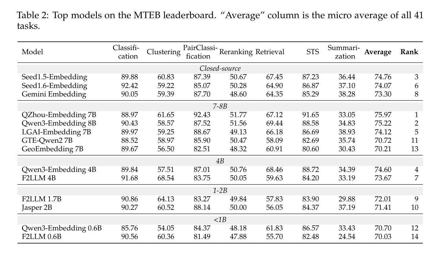 - F2LLM-4B在MTEB英语排行榜上排名第二,总体排名第七。