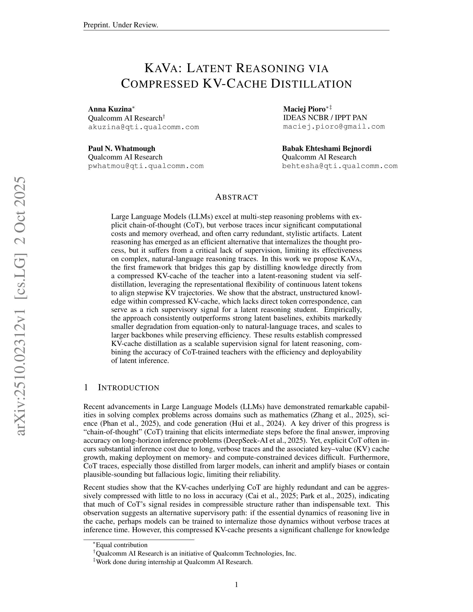 大型语言模型(LLMs)在多步推理问题上表现出色,但明确的思维链(CoT)追踪方式会带来显著的计算成本和内存负担,并常带有冗余的风格化产物。潜在推理作为一种高效替代方案,能够内化思维过程,但缺乏监督是其关键缺陷,限制了其在复杂自然语言推理追踪上的有效性。本研究提出KaVa框架,首次通过自我蒸馏的方式,从教师模型的压缩键值缓存(KV-cache)中汲取知识,传授给潜在推理的学生模型。利用连续潜在符号的表示灵活性,对齐键值对的逐步轨迹。研究显示,压缩KV缓存中的抽象、非结构化知识,尽管缺乏直接的符号对应关系,但可作为潜在推理学生模型的丰富监督信号。实证结果表明,该方法在强基线潜在推理模型上表现更优秀,在自然语言追踪到方程追踪的降解程度显著降低,并在大型骨干网络上保持高效性。这些结果确立了压缩KV缓存蒸馏作为潜在推理的可扩展监督信号,结合了有思维链教师模型的准确性、潜在推理的效率和可部署性。