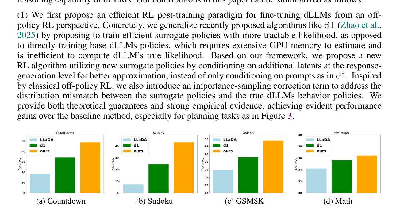 - 通过离线强化学习训练代理政策,作为对真实dLLM政策的近似,使可能性更加易于处理。