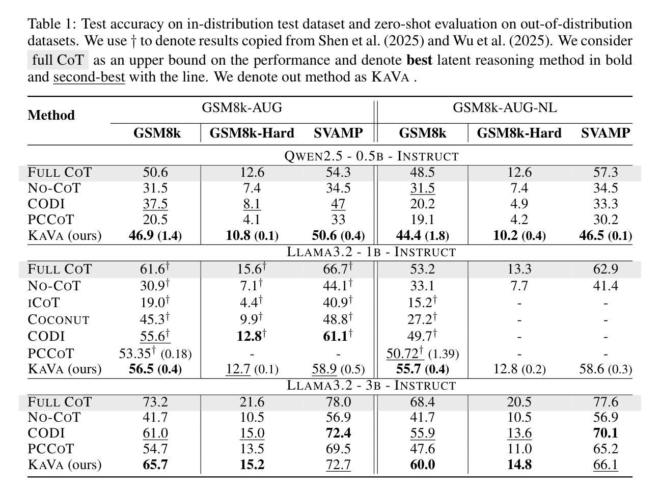- KaVa框架在强基线潜在推理模型上表现优秀,自然语言和方程追踪之间的降解程度降低。