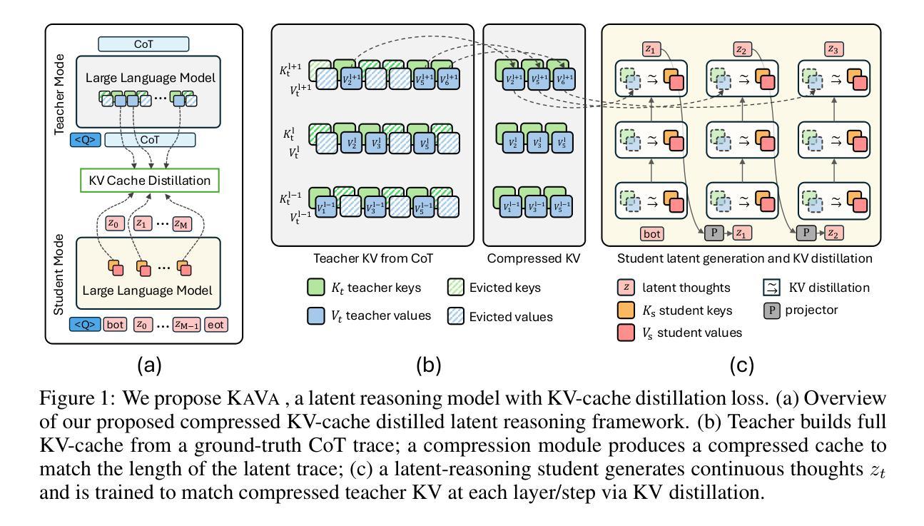 大型语言模型(LLM)在处理具有明确思维链(CoT)的多步推理问题时表现出色,但冗长的跟踪会产生显著的计算成本和内存开销,并经常带有冗余、风格化的特征。隐式推理作为一种有效的替代方法,能够内化思维过程,但它缺乏关键的监督,在复杂、自然语言推理轨迹上的效果有限。在这项工作中,我们提出了KaVa框架,它通过自蒸馏的方式,从压缩的KV缓存中提取知识并直接传递给进行隐性推理的学生模型,以此填补这一空白。我们利用连续潜在代币的代表性灵活性来对齐逐步KV轨迹。我们证明了压缩KV缓存中的抽象、非结构化知识可以作为隐性推理学生的丰富监督信号,即使没有直接的代币对应关系。从实证结果来看,该方法始终优于强大的隐性基准测试,从方程式到自然语言轨迹的退化明显较小,并且在保持效率的同时扩展到更大的主干网络。这些结果确立了压缩KV缓存蒸馏作为隐性推理的可扩展监督信号,结合了教师CoT训练的准确性和学生隐性推理的效率与可部署性。