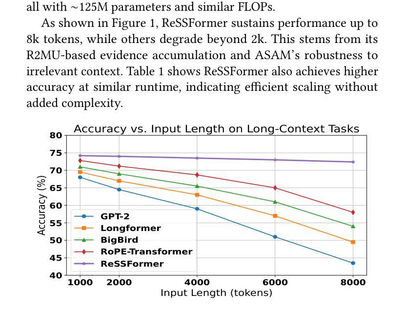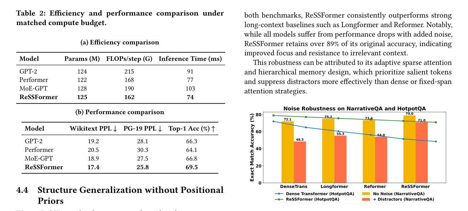 虽然Transformer架构在各个领域表现出了令人印象深刻的可扩展性,但它们仍然面临着长上下文推理、计算效率和结构泛化方面的挑战,这主要是因为它们存在刚性层堆叠、密集注意力和依赖位置编码的问题。我们提出了ReSSFormer,这是一种递归稀疏结构Transformer,集成了三种互补的创新:用于具有有限深度的迭代推理的循环推理与内存单元(R2MU)、用于高效和有针对性的上下文选择的自适应稀疏注意力模块(ASAM)以及用于无位置结构归纳的自我组织编码器结构(SOES)。ReSSFormer用递归推理替代了传统的深度堆叠,用令牌和专家级的稀疏性替代了全注意力,并直接从内容中建模潜在令牌拓扑。在语言建模、多跳问答和结构敏感任务中,ReSSFormer在可比的FLOPs和参数预算下始终优于强大的基准测试,突显了其可扩展性、效率和结构灵活性。