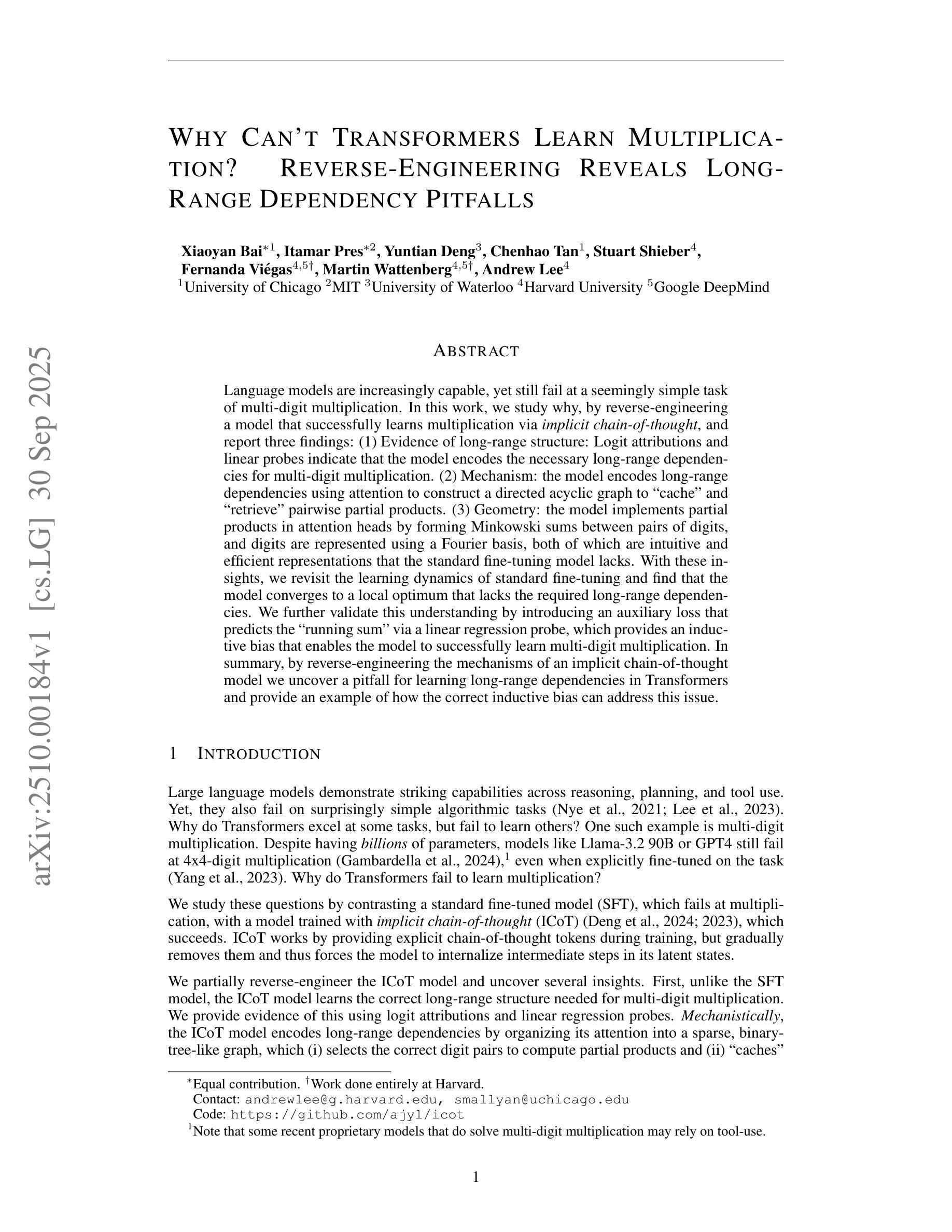 大型语言模型虽功能日益强大,但在进行多位数乘法运算的简单任务时仍会出现困难。本研究通过逆向工程研究了一个成功学习乘法运算的模型,发现模型通过隐式思维链编码了必要的长程依赖关系,并利用注意力机制构建有向无环图以缓存和检索部分乘积。模型的乘法几何运算中包括闵可夫斯基和以及傅里叶基底等直观和高效的表示形式。缺乏这种隐式思维链机制的模型容易陷入缺乏必要长程依赖的局部最优解。通过引入预测运行和的辅助损失函数,提供了学习长程依赖的归纳偏置解决方案。总之,本研究揭示了Transformer中学习长程依赖的陷阱,并展示了如何借助归纳偏置来解决这一问题。