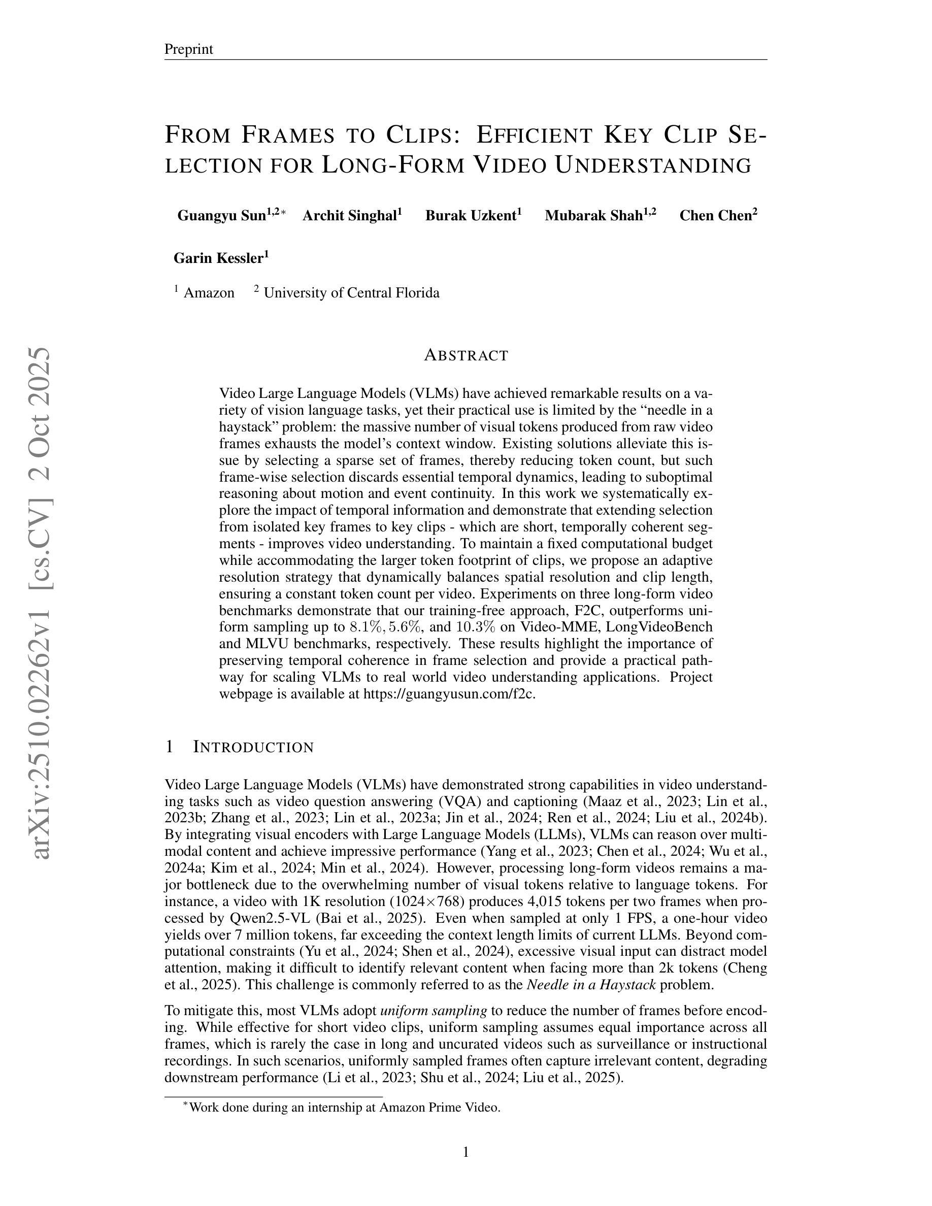 Video Large Language Models (VLMs) have achieved remarkable results on a variety of vision language tasks, yet their practical use is limited by the “needle in a haystack” problem: the massive number of visual tokens produced from raw video frames exhausts the model’s context window. Existing solutions alleviate this issue by selecting a sparse set of frames, thereby reducing token count, but such frame-wise selection discards essential temporal dynamics, leading to suboptimal reasoning about motion and event continuity. In this work we systematically explore the impact of temporal information and demonstrate that extending selection from isolated key frames to key clips, which are short, temporally coherent segments, improves video understanding. To maintain a fixed computational budget while accommodating the larger token footprint of clips, we propose an adaptive resolution strategy that dynamically balances spatial resolution and clip length, ensuring a constant token count per video. Experiments on three long-form video benchmarks demonstrate that our training-free approach, F2C, outperforms uniform sampling up to 8.1%, 5.6%, and 10.3% on Video-MME, LongVideoBench and MLVU benchmarks, respectively. These results highlight the importance of preserving temporal coherence in frame selection and provide a practical pathway for scaling Video LLMs to real world video understanding applications. Project webpage is available at https://guangyusun.com/f2c .