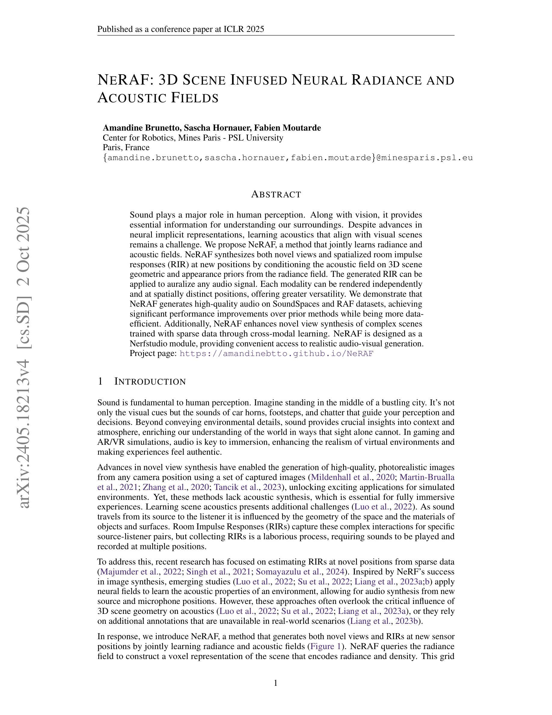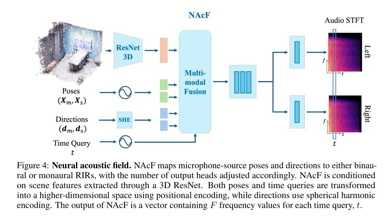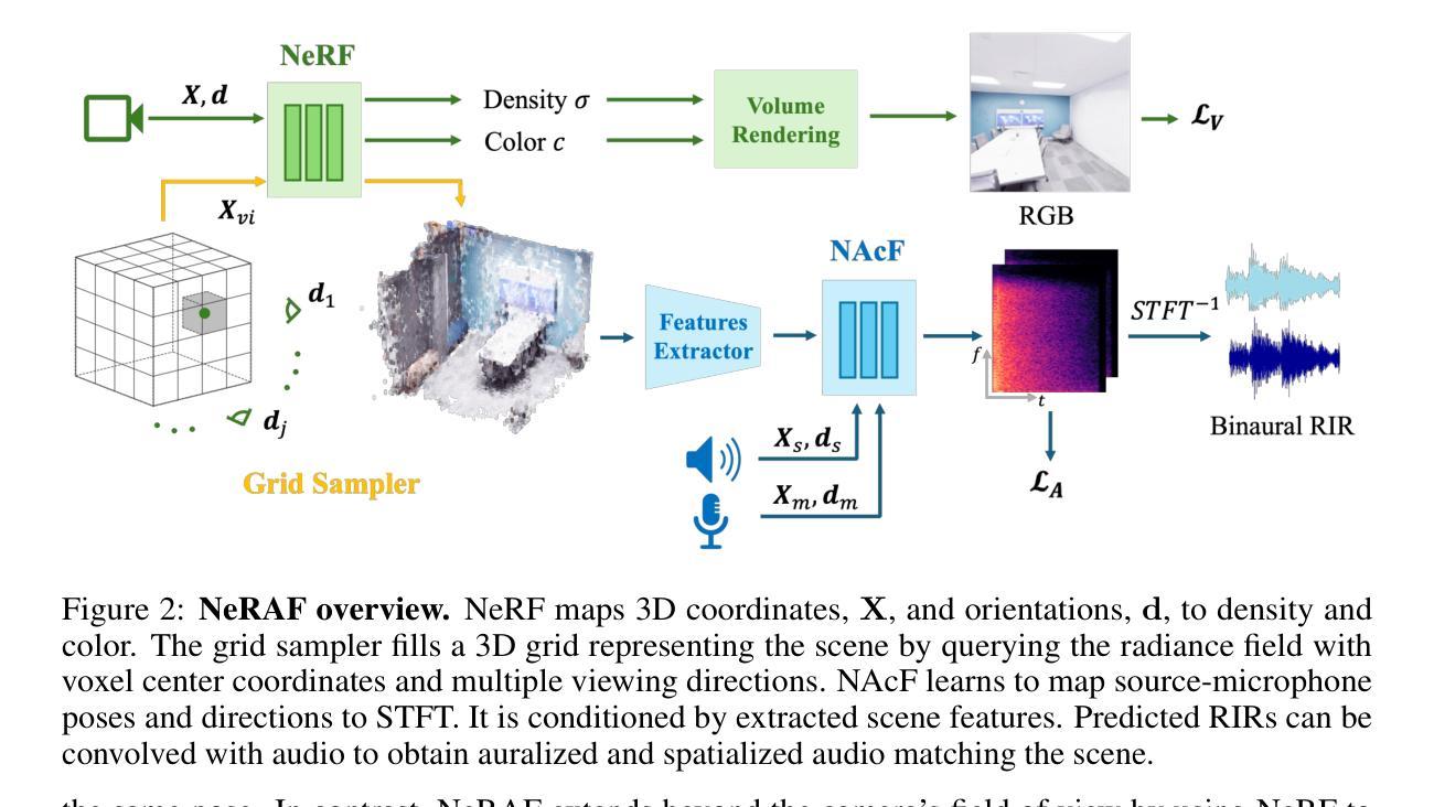 - NeRAF方法联合学习声学场和辐射场,合成新的视角和位置的空间化房间脉冲响应(RIR)。