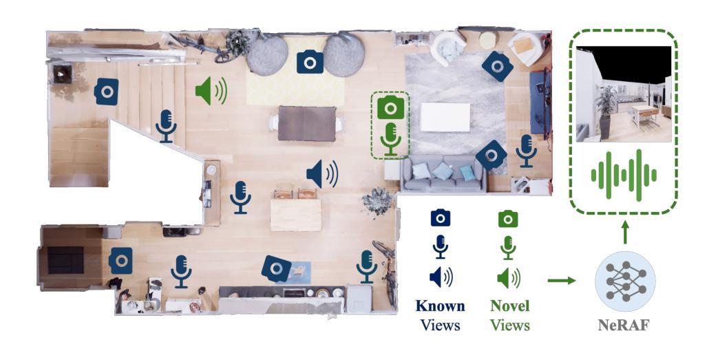 本文探讨了声音在人类感知中的重要性,并指出尽管神经隐式表示有所进展,但将视觉场景与声学对齐的学习仍然是一个挑战。为此,本文提出了NeRAF方法,该方法联合学习声学场和辐射场,通过利用辐射场的3D场景几何和外观先验条件来合成新的视角和位置的空间化房间脉冲响应(RIR)。NeRAF生成的RIR可应用于任何音频信号的音效化。每个模态都可以独立呈现,并在空间不同位置呈现,提供了更大的灵活性。在SoundSpaces和RAF数据集上的实验表明,NeRAF生成的高质量音频在性能和数据处理效率方面都实现了显著的改进,并增强了使用稀疏数据的复杂场景的新视角合成能力。NeRAF作为Nerfstudio模块设计,便于访问真实的音频-视觉生成。
