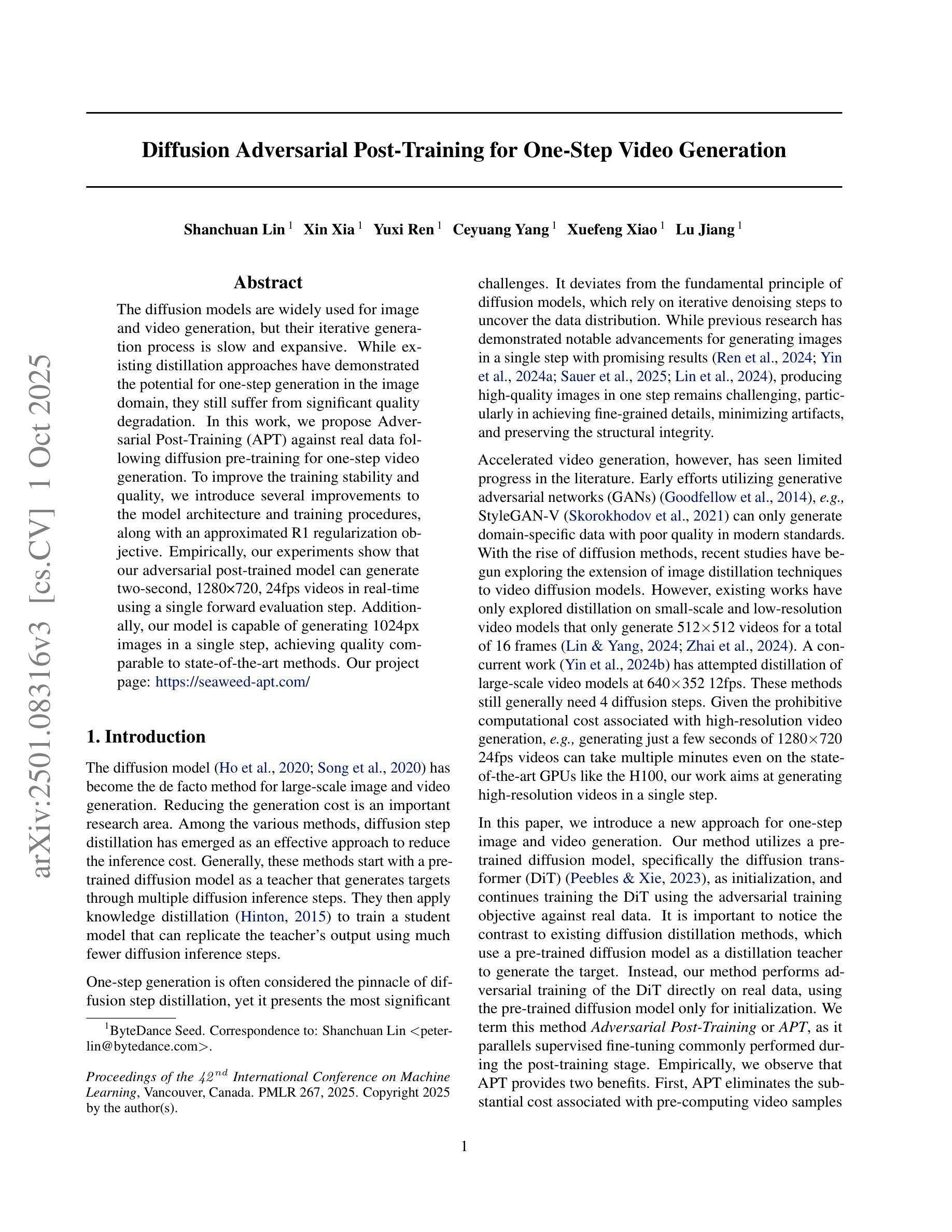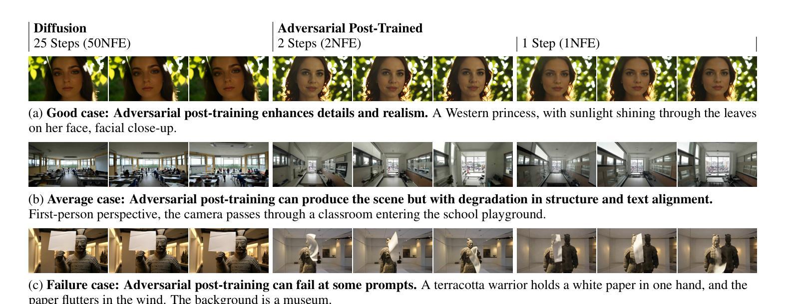 - 提出对抗后训练(APT)方法,结合扩散预训练,实现视频的一步生成。