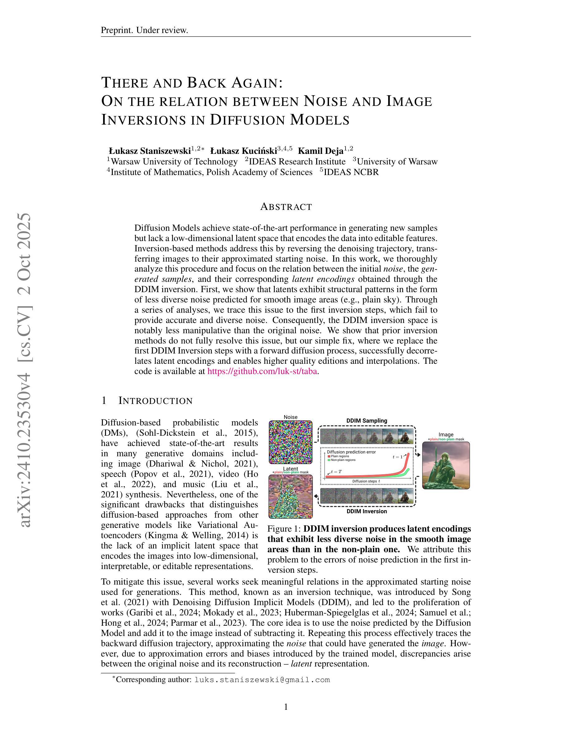 扩散模型在生成新样本方面达到最先进的性能水平,但它缺乏一个低维潜在空间来编码可编辑的特征。基于反转的方法解决了这一问题,通过将图像反转回其近似初始噪声来实现数据的转换。在这项工作中,我们全面分析了这一过程,并重点关注初始噪声、生成的样本以及通过DDIM反转获得的相应潜在编码之间的关系。首先,我们发现在潜在空间中存在着结构性的模式,即在平滑图像区域(如晴朗的天空)预测的噪声多样性较低。通过一系列分析,我们发现这个问题源于最初的反转步骤,这些步骤无法提供准确和多样的噪声。因此,DDIM反转空间的操控性明显低于原始噪声。我们表明,先前的反转方法并没有完全解决这个问题,但我们的简单修复方法——用正向扩散过程替换最初的DDIM反转步骤——成功地解耦了潜在编码并启用了更高质量的编辑和插值。相关代码可访问于https://github.com/luk-st/taba。