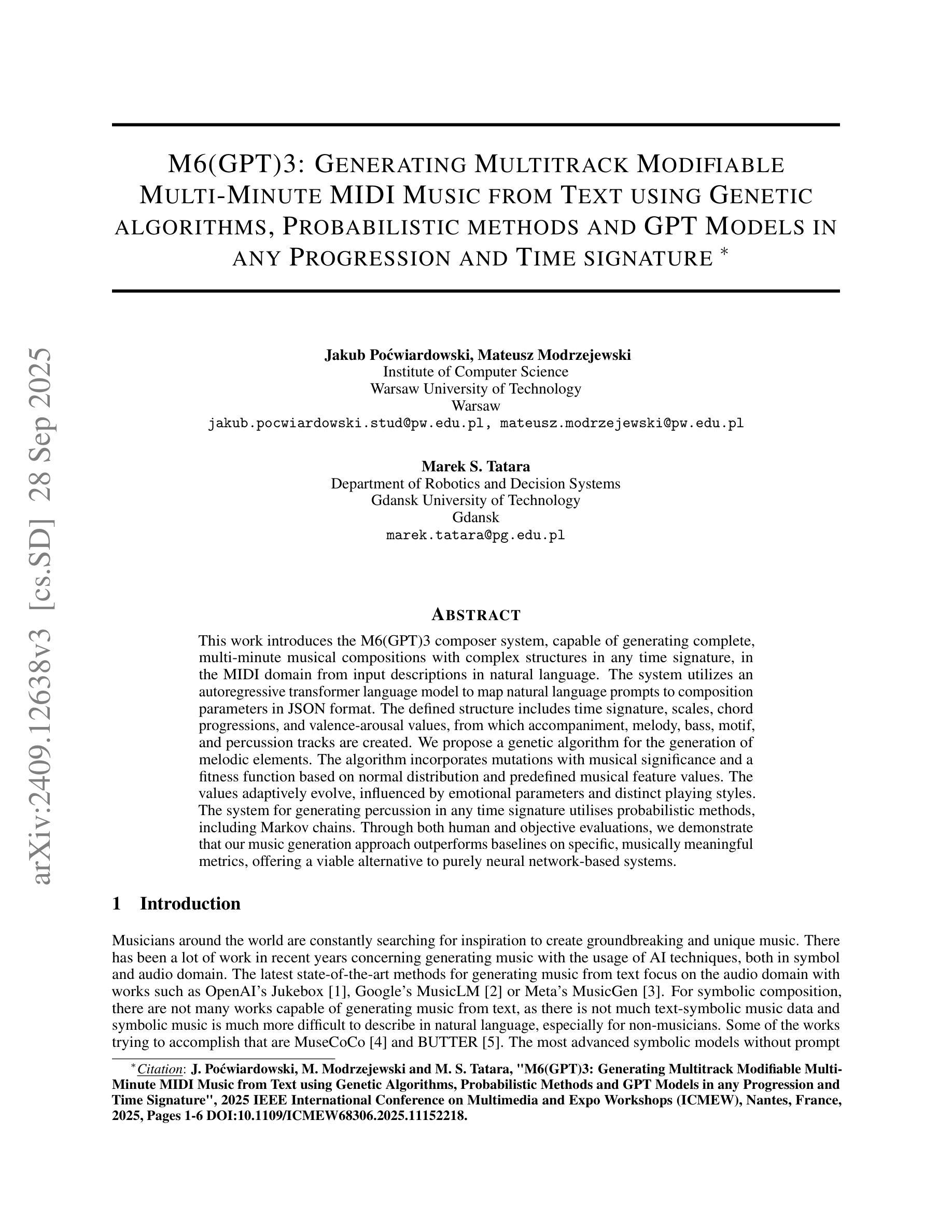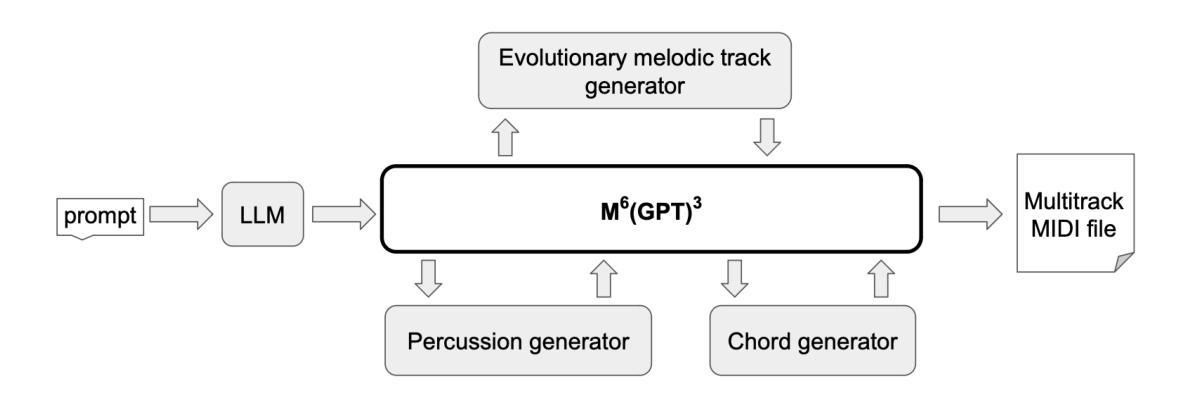 本文介绍了M6(GPT)3作曲系统,该系统能够在MIDI领域中根据自然语言描述生成完整、多分钟的具有复杂结构的音乐。系统采用自回归转换器语言模型,将自然语言提示映射到JSON格式的作曲参数上。所定义的参数结构包括时间签名、音阶、和弦进展以及情感值,由此生成伴奏、旋律、低音、动机和打击乐轨道。我们提出了一种用于生成旋律元素的遗传算法。该算法结合了具有音乐意义的突变和基于正态分布和预定义音乐特征值的适应度函数。这些值会适应性地演变,受到情绪参数和独特演奏风格的影响。系统生成任何时间签名的打击乐部分采用了概率方法,包括马尔可夫链。通过人类和客观评估,我们证明了我们的音乐生成方法在特定的音乐意义上优于基线方法,为仅基于神经网络的系统提供了可行的替代方案。