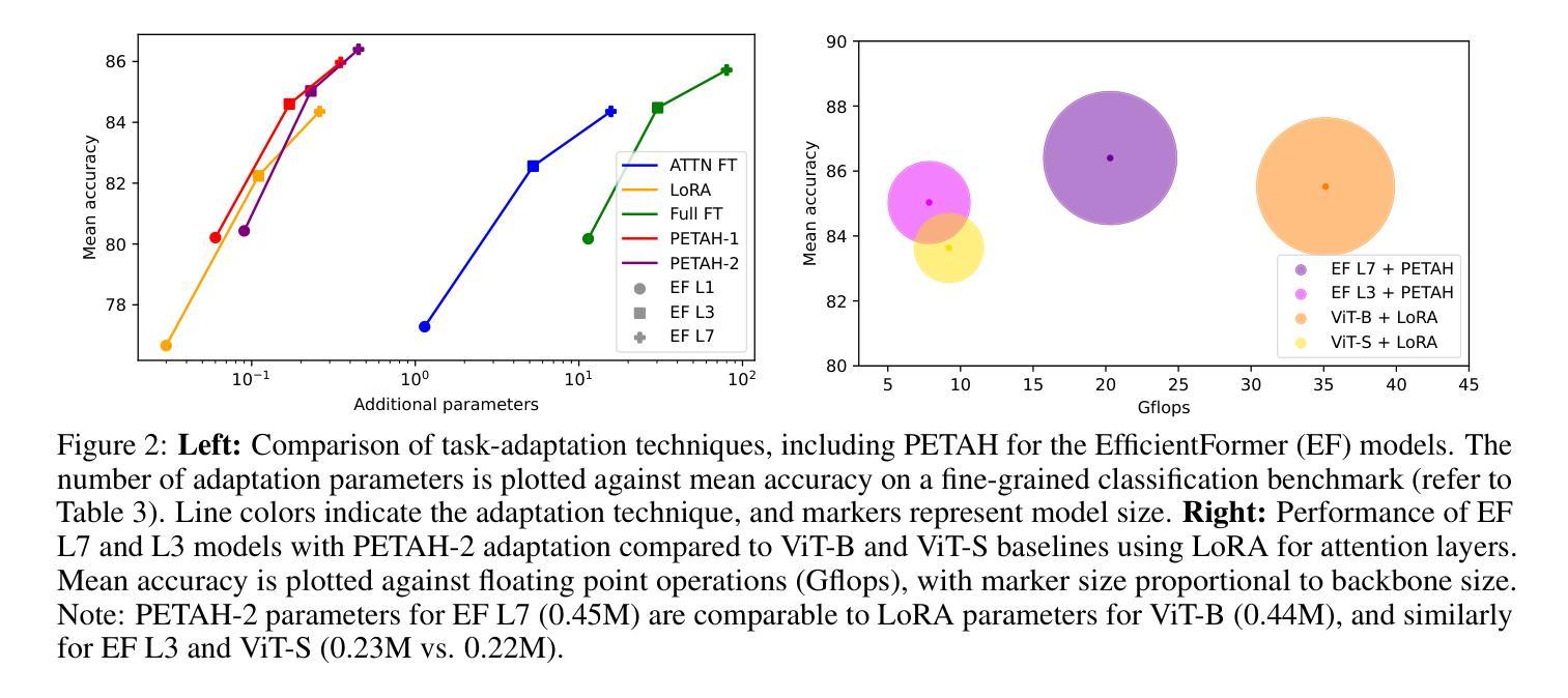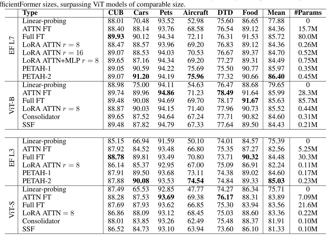 - 在分类和其他视觉任务上,PETAH自适应混合模型的性能优于ViT的任务适应性技术。