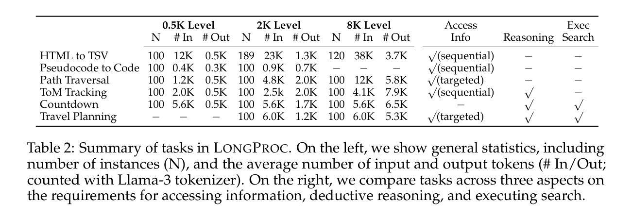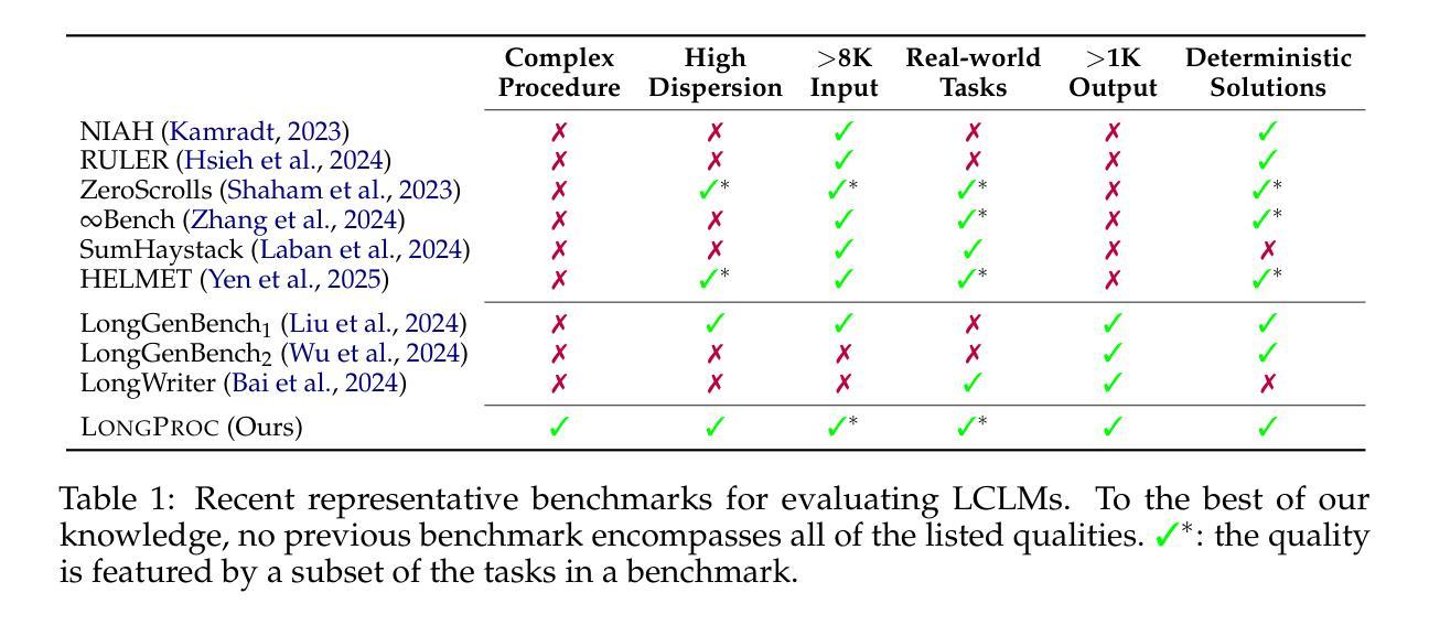 - LongProc任务要求模型集成高度分散的信息并进行长文本生成,挑战了模型的详细程序指令遵循能力、信息合成和推理能力。
