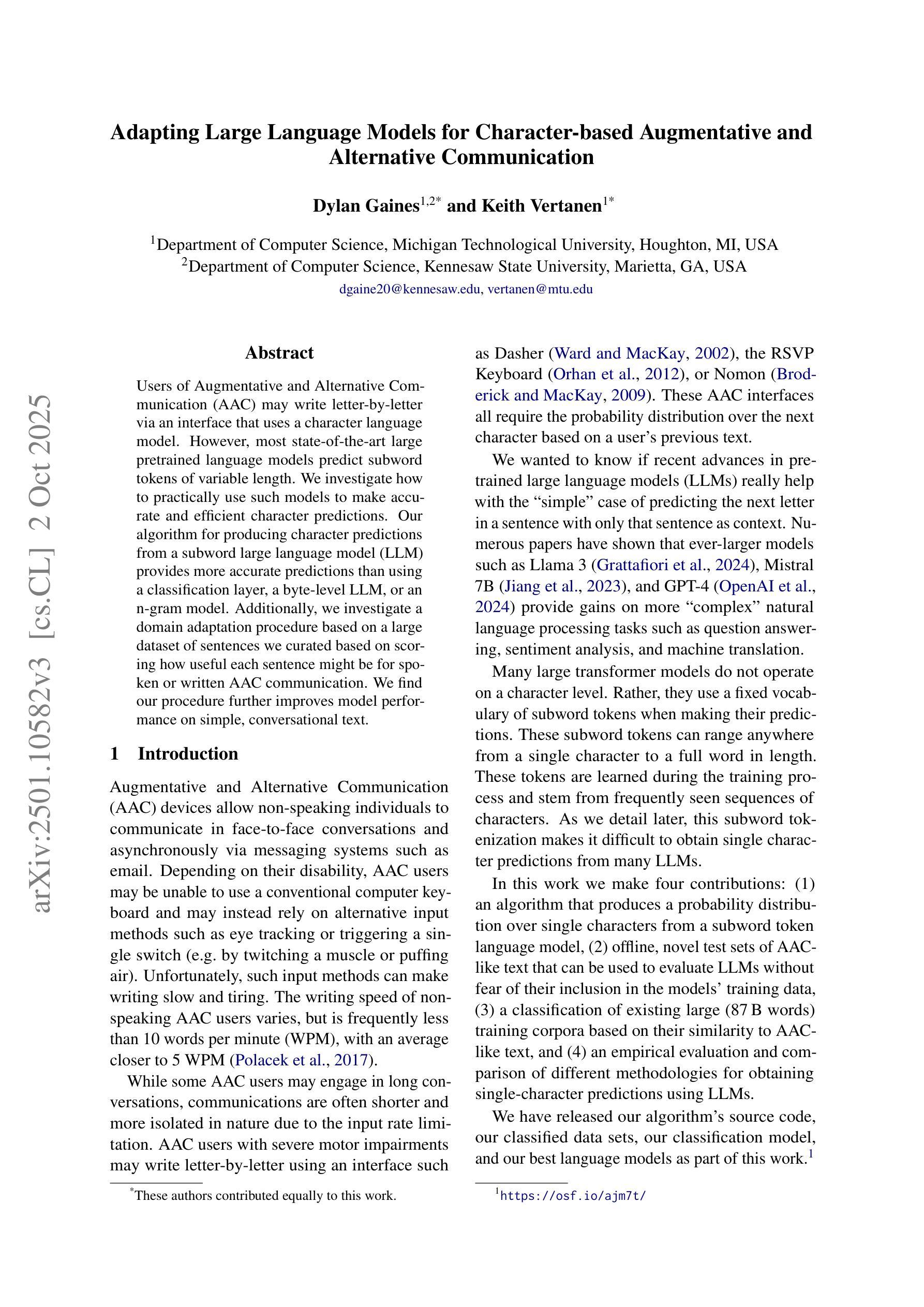 增强和替代通信(AAC)的用户可以通过使用字符语言模型的界面逐字进行书写。然而,大多数最先进的大型预训练语言模型预测的是可变长度的子词标记。我们调查了如何实际使用此类模型进行准确高效的字符预测。我们从子词大型语言模型(LLM)中产生字符预测的算法,比使用分类层、字节级LLM或n-gram模型提供更准确的预测。此外,我们还调查了一种基于我们根据每个句子对口语或书面AAC通信的潜在作用评分而精心制作的大量数据集进行的域自适应过程。我们发现我们的过程在简单的对话文本上进一步提高了模型性能。
