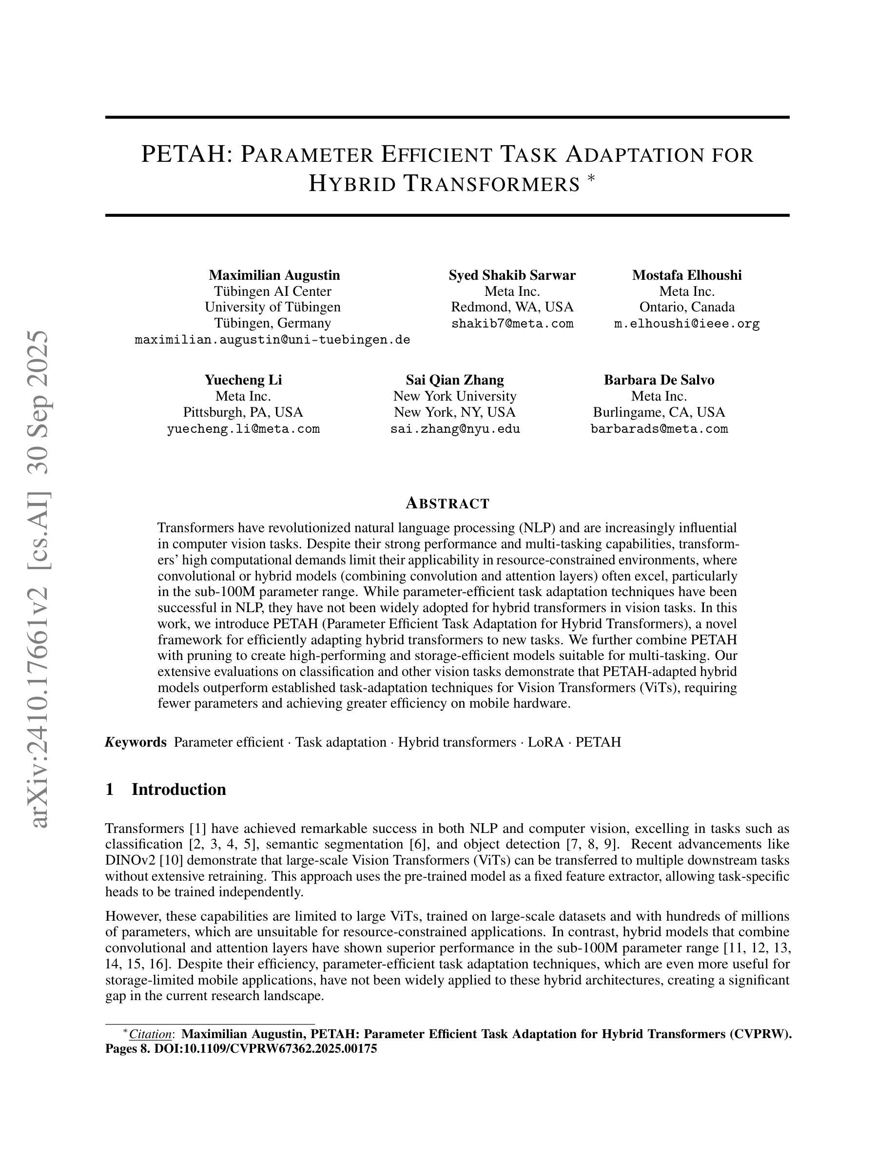 随着自然语言处理(NLP)的成功,计算机视觉领域开始转向使用Transformer模型。虽然Transformer表现良好并提供有前景的多任务性能,但由于其高计算需求,许多资源受限的应用仍依赖于卷积或混合模型。本文探讨了如何实现最佳的任务适应性,并引入了PETAH:混合Transformer的参数高效任务适应性技术。我们还通过剪枝进一步提高PETAH适应性,以实现对多任务的高效处理。在分类和其他视觉任务上的广泛评估表明,我们的PETAH自适应混合模型在参数需求更少且移动端硬件效率更高的同时,优于ViT的任务适应性技术。