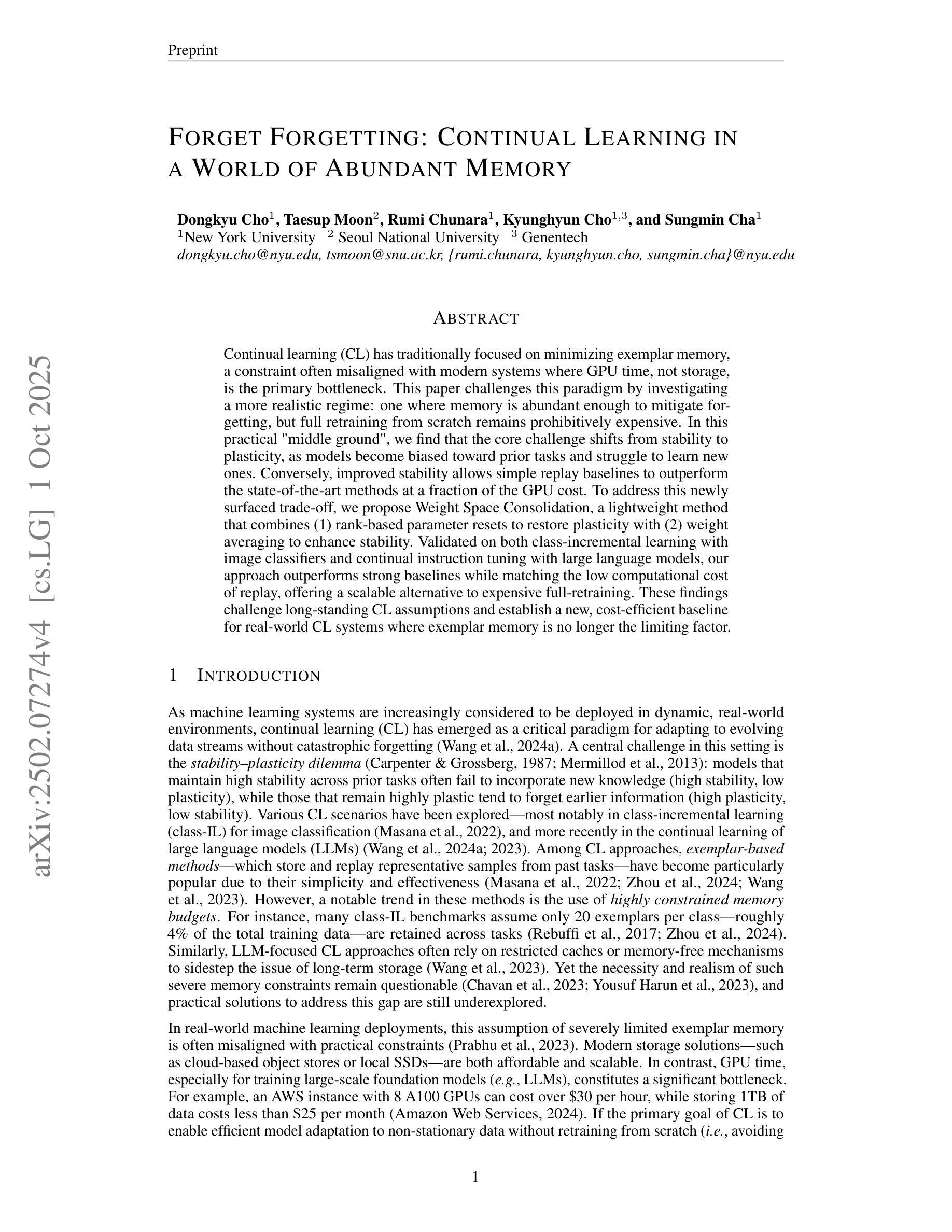 持续学习(CL)传统上主要关注减少样本内存,但这种约束与现代系统往往不匹配,因为现代系统的主要瓶颈在于GPU时间而非存储空间。本文挑战了这一范式,探讨了一个更现实的情境:一个内存充足足以缓解遗忘但完全从头开始重新训练仍然过于昂贵的情境。在这种实际的“中间地带”中,我们发现核心挑战从稳定性转向了可塑性,因为模型偏向于先前的任务,难以学习新任务。相反,增强稳定性使得简单的回放基线可以在GPU成本极小的情况下超越最新技术方法。为了应对新出现的这种权衡,我们提出了权重空间巩固(Weight Space Consolidation),这是一种轻量级的方法,它将(1)基于排名的参数重置用于恢复可塑性,(2)权重平均用于增强稳定性。我们的方法经过图像分类器的类增量学习和大型语言模型的持续指令调整验证,在超越强大基线的同时匹配了回放的低计算成本,为昂贵的完全重新训练提供了可伸缩的替代方案。这些发现挑战了长期存在的CL假设,并为现实世界中的CL系统建立了新的低成本基线,其中样本内存不再是限制因素。
