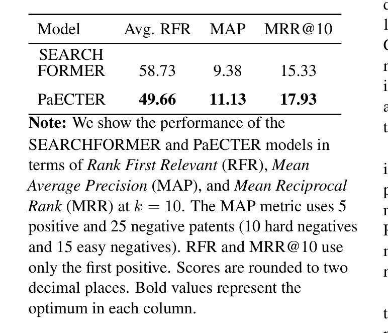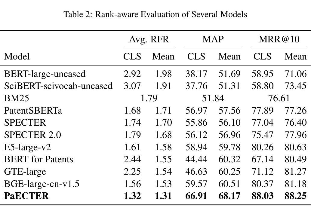 - PaECTER能够预测至少一个最相似专利的平均排名为1.32。