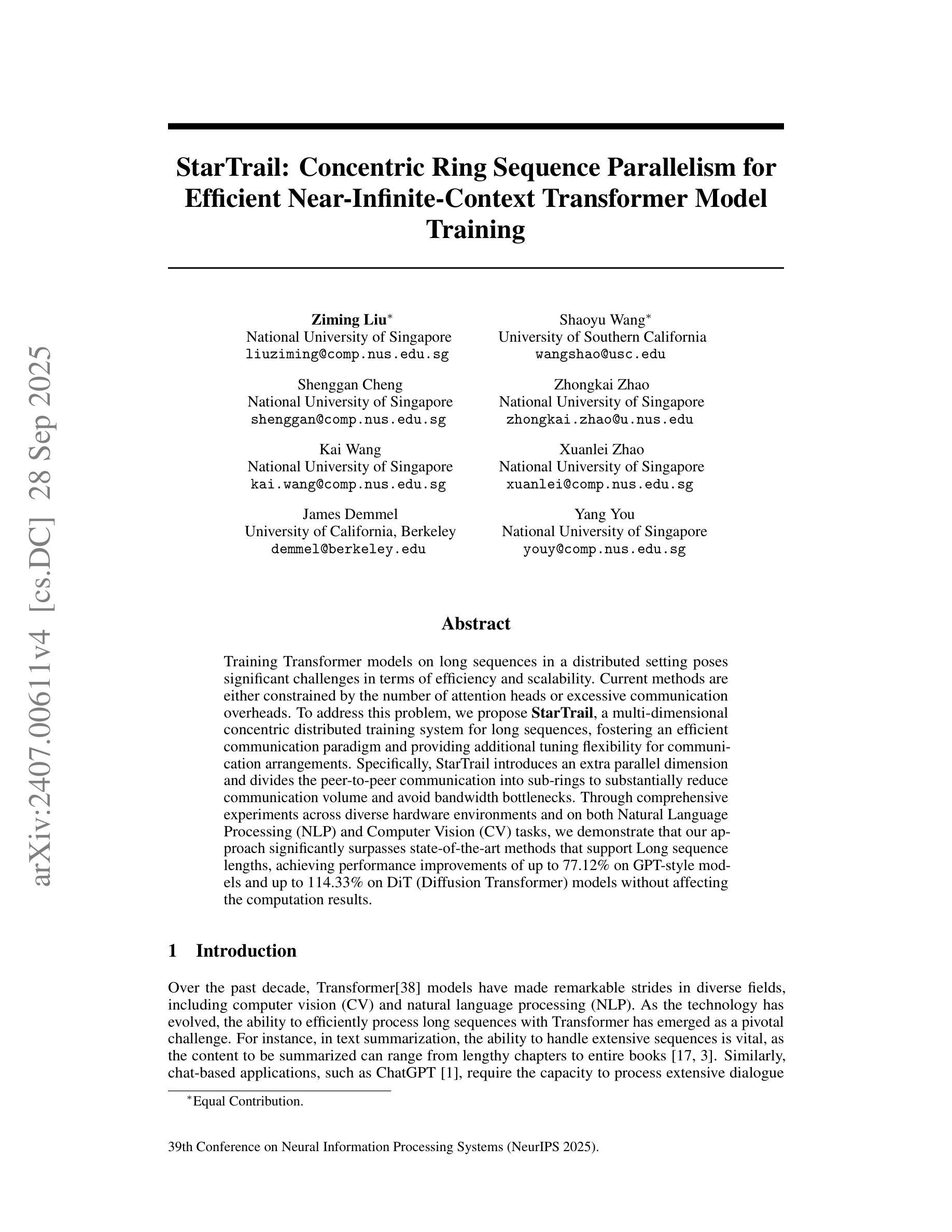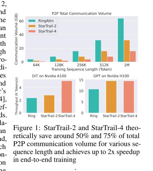 在分布式环境中训练长序列的Transformer模型面临效率和可扩展性的挑战。针对这一问题,本文提出StarTrail系统,该系统采用多维同心分布式训练架构,优化了通信模式并为通信安排提供了额外的调整灵活性。StarTrail通过引入额外的并行维度和将点对点通信划分为子环来减少通信量并避免带宽瓶颈。实验表明,StarTrail在支持长序列长度方面显著优于现有技术方法,GPT风格模型和DiT(扩散转换器)模型的性能分别提高了77.12%和最高可达上超过我们的做法通过简化的创新算法表明序列比现有技术方法提高了高达上提高了高达上超过我们的做法。通过在多样化的硬件环境和自然语言处理(NLP)和计算机视觉(CV)任务上的全面实验,证明了StarTrail的有效性。这些方法在不影响计算结果的情况下实现了显著的性能提升。