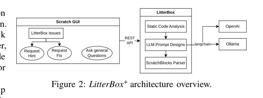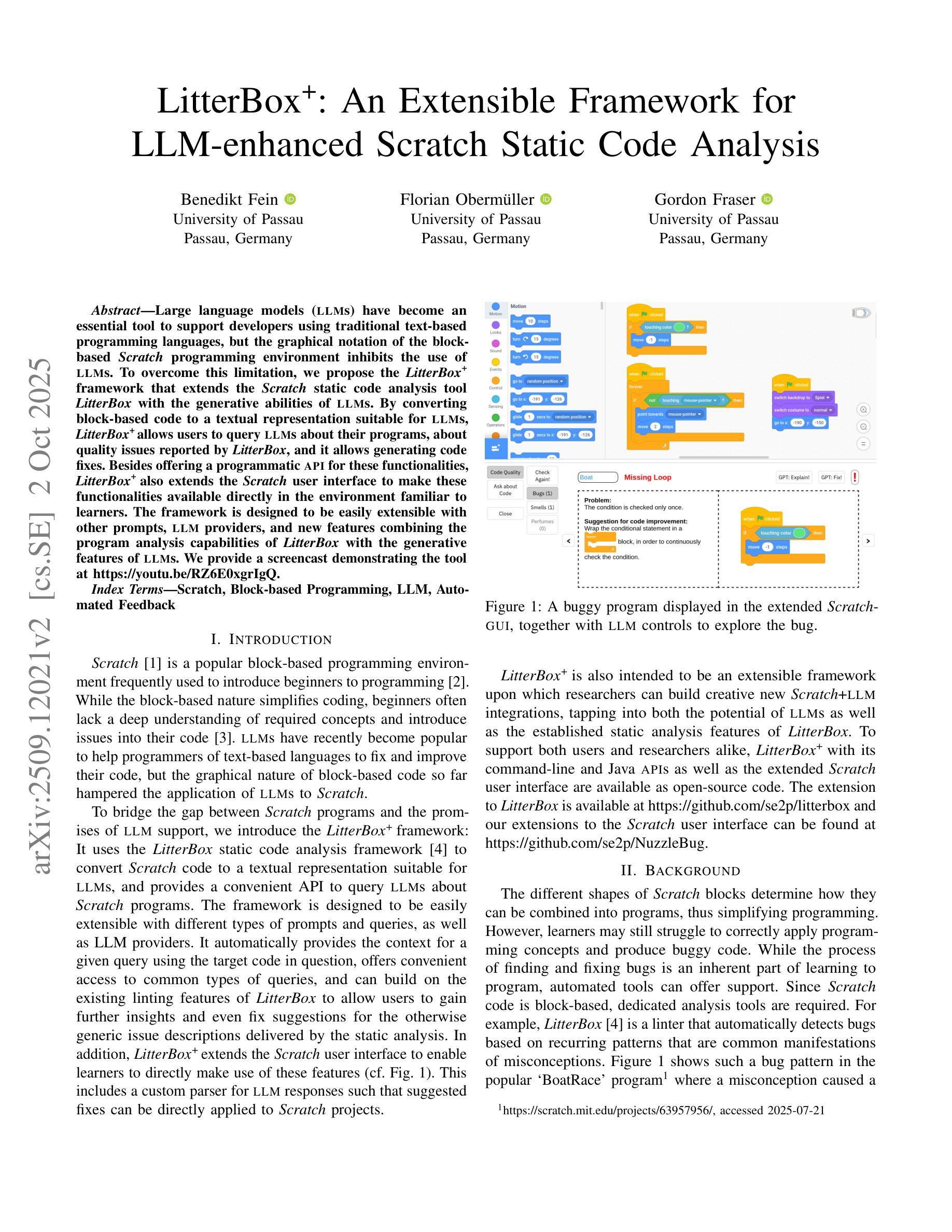 LLM已成为开发者使用传统文本编程语言的重要工具,但由于Scratch编程环境的图形符号表示限制了LLM的使用。为克服这一局限,提出LitterBox+框架,该框架扩展了Scratch静态代码分析工具LitterBox,融合了LLM的生成能力。LitterBox+能将基于块的代码转换为适合LLM的文本表示形式,使用户能够查询LLM关于他们的程序、关于LitterBox报告的质量问题,并生成代码修复。除了通过这些功能的程序化API提供这些功能外,LitterBox+还扩展了Scratch用户界面,使这些功能在学习者熟悉的环境中可用。该框架设计易于与其他提示、LLM提供商和新功能扩展结合,将LitterBox的程序分析功能与LLM的生成功能相结合。可通过https://youtu.be/RZ6E0xgrIgQ观看演示该工具的视频。