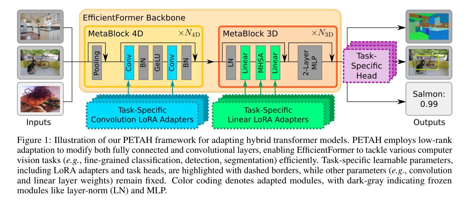 继其在自然语言处理(NLP)领域的成功后,计算机视觉领域也开始转向使用Transformer模型。虽然Transformer表现良好并提供有前景的多任务性能,但由于其计算需求较高,许多资源受限的应用程序仍然依赖于卷积或混合模型,这些模型结合了卷积层和注意力层的优点,并在小于100M的参数范围内取得了最佳结果。同时,允许使用一个共享的Transformer主干进行多个下游任务的任务适配技术,可以在性能损失极小的情况下实现巨大的存储节省,但尚未被混合Transformer所采用。在这项工作中,我们研究了如何实现最佳的任务适配性能,并介绍了PETAH:混合Transformer的参数高效任务适配。我们还将PETAH适配与修剪相结合,以实现多任务的高性能且存储友好的模型。在分类和其他视觉任务的广泛评估中,我们证明了我们的PETAH适配的混合模型在参数更少、移动硬件上效率更高的同时,优于ViT的现有任务适配技术。