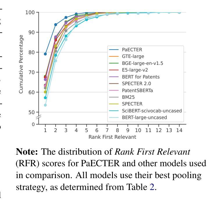 PaECTER是一个针对专利的开源文档级别编码器。我们使用审查员添加的引文信息对专利的BERT模型进行微调,以生成专利文档的数值表示。在相似度任务方面,PaECTER的表现优于当前专利领域中使用的最先进的模型。更具体地说,我们的模型在专利引文预测测试数据集上的不同排名评估指标上,超越了针对专利的预训练语言模型(专利BERT)和通用文本嵌入模型(例如E5、GTE和BGE)。当与25篇不相关的专利相比时,PaECTER平均在排名第一时至少预测出一篇最相似的专利,相似度平均值为1.32。由PaECTER从专利文本生成的数值表示可用于下游任务,如分类、追踪知识流或语义相似性搜索。语义相似性搜索对于发明家和专利审查员的现有技术搜索来说尤其重要。