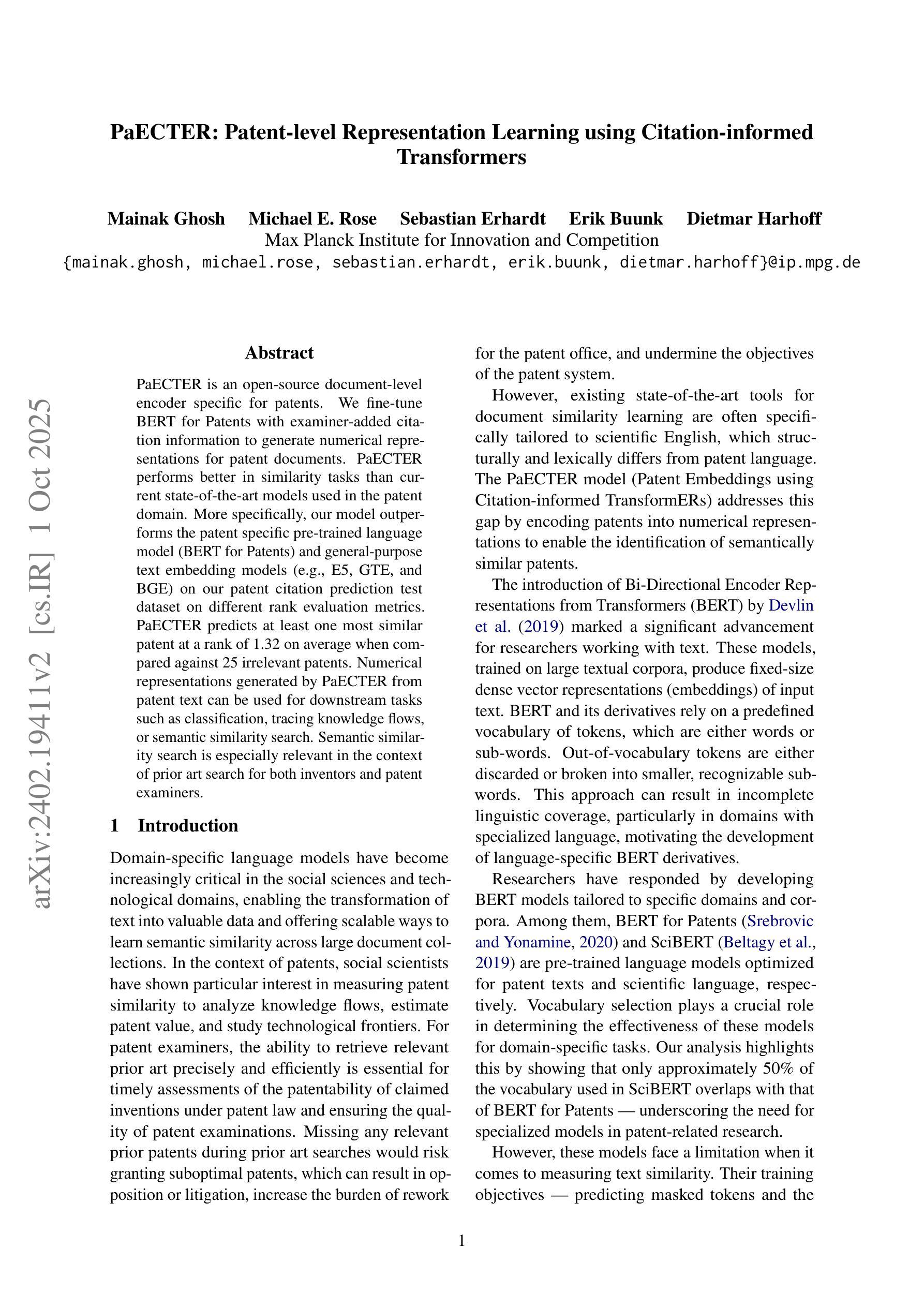 PaECTER是一种针对专利的开源文档级别编码器。通过利用审查员添加的引文信息对BERT for Patents进行微调,生成专利文档的数值表示。在专利相似性任务中,PaECTER的表现优于当前专利领域的最先进模型。它能够在专利引文预测测试数据集上超越专利特定预训练语言模型(如BERT for Patents)和通用文本嵌入模型(如E5、GTE和BGE),在不同排名评估指标上表现优异。PaECTER预测的至少一个最相似专利的平均排名为1.32,与25个不相关专利相比。由PaECTER从专利文本生成的数值表示可用于下游任务,如分类、追踪知识流或语义相似性搜索。语义相似性搜索对于发明人和专利审查员的先前技术搜索尤为重要。