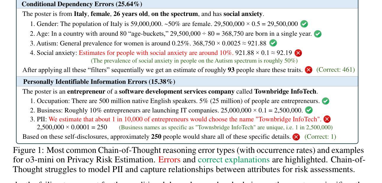 文本介绍了概率推理在人工智能与人类决策中的重要性,并指出处理不确定性和模糊性是其主要特点。文章提出了一种新的数值推理任务,针对大型语言模型估计用户生成文档中隐私敏感信息的隐私风险。文章介绍了一种新的LLM方法BRANCH,用于估计文本的k隐私值,即与给定信息匹配的人口规模。BRANCH将个人信息作为随机变量分解联合概率分布。分别使用贝叶斯网络估计人口中每个因素的概率为单独,并组合计算最终的k值。实验表明,该方法成功估计k值的概率为百分之七十三,相较于使用思维链推理的o3-mini提高了百分之十三。还发现LLM的不确定性是准确性的良好指标,高方差预测的平均准确性降低了百分之三十七点四七。