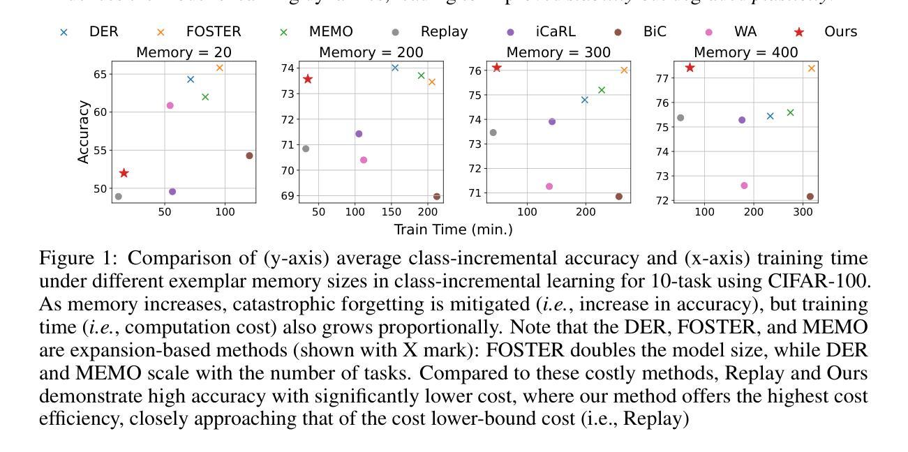 - 该方法在图像分类器的类增量学习和大型语言模型的连续指令调整中进行了验证,性能优于强基线,同时匹配了回放(replay)的低计算成本。
