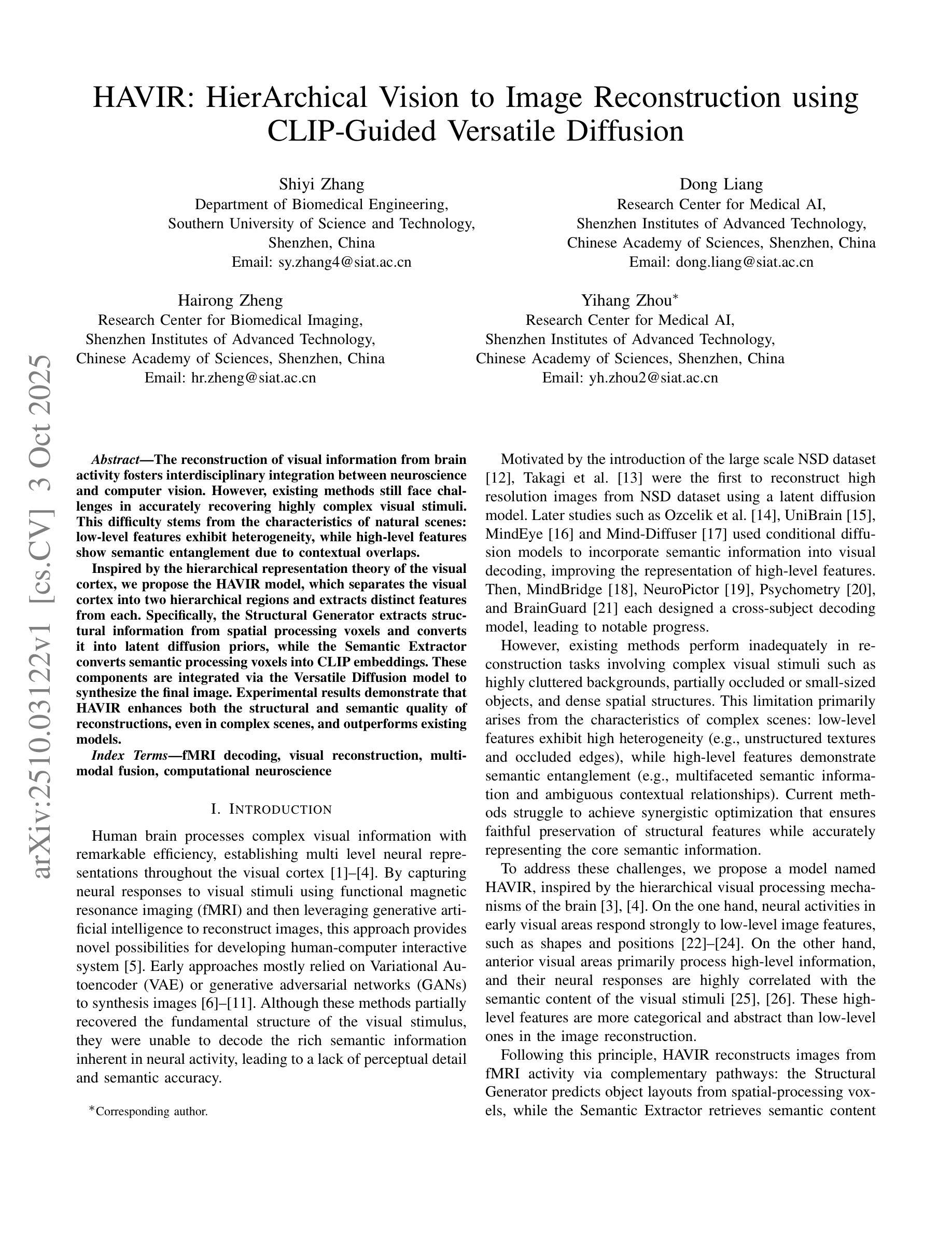 从脑活动中重建视觉信息促进了神经科学与计算机视觉之间的跨学科整合。然而,现有方法仍然在准确恢复高度复杂的视觉刺激方面面临挑战。这一难题源于自然场景的特性:低级特征表现出异质性,而高级特征由于上下文重叠而表现出语义纠缠。受视觉皮层分层表示理论的启发,我们提出了HAVIR模型,该模型将视觉皮层分为两个层次区域,并从每个区域中提取不同的特征。具体而言,结构生成器从空间处理体素中提取结构信息,并将其转换为潜在扩散先验知识,而语义提取器将语义处理体素转换为CLIP嵌入。这些组件通过通用扩散模型集成,合成最终图像。实验结果表明,HAVIR即使在复杂场景中也能提高重建的结构和语义质量,并优于现有模型。