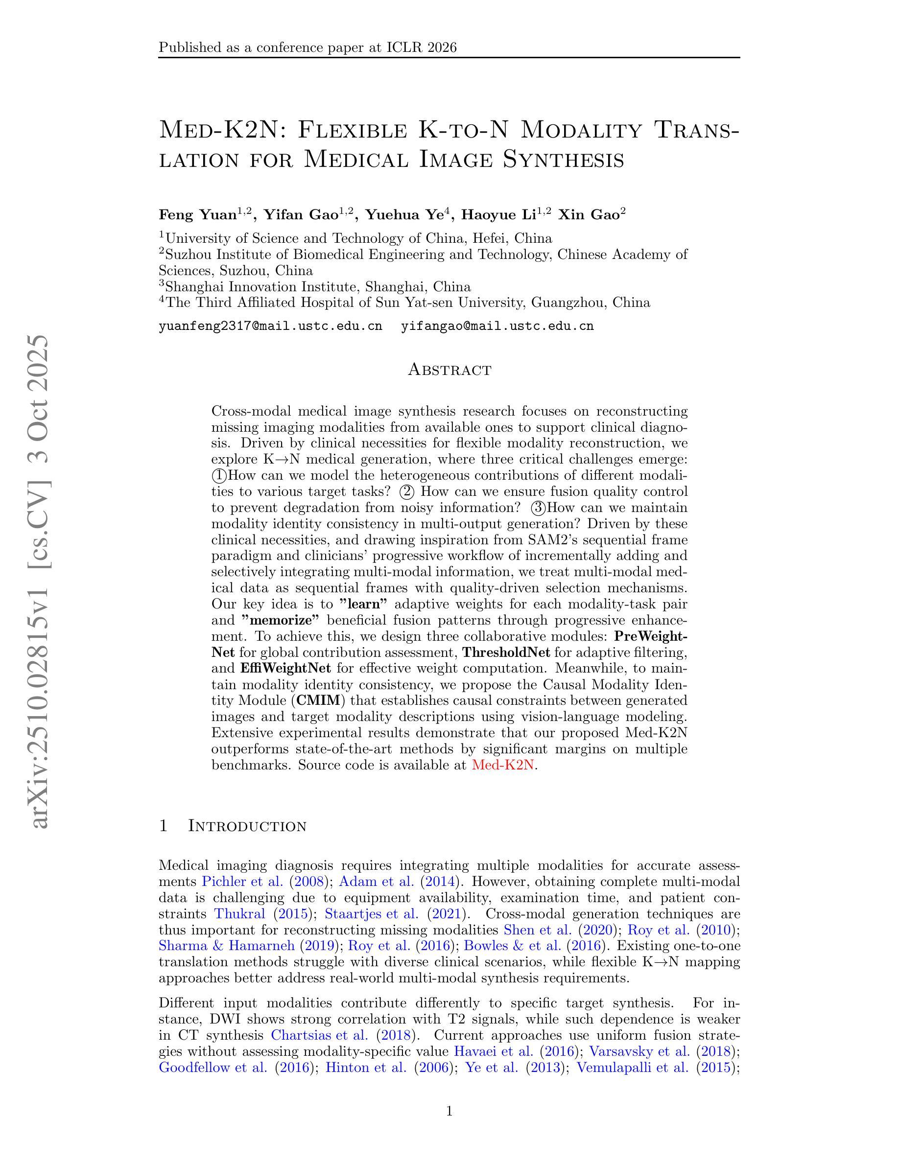 本文研究了跨模态医学图像合成,旨在从已有的成像模态重建缺失的模态,以支持临床诊断。文章提出了Med-K2N方法,通过模拟多模态数据的顺序框架和临床医生逐步的工作流程,对多模态医学数据进行处理。通过设计PreWeightNet、ThresholdNet和EffiWeightNet三个协作模块以及Causal Modality Identity Module(CMIM)来优化合成过程并确保生成的图像保持目标模态的身份一致性。实验结果表明,所提出的方法在多个基准测试中显著优于现有技术。