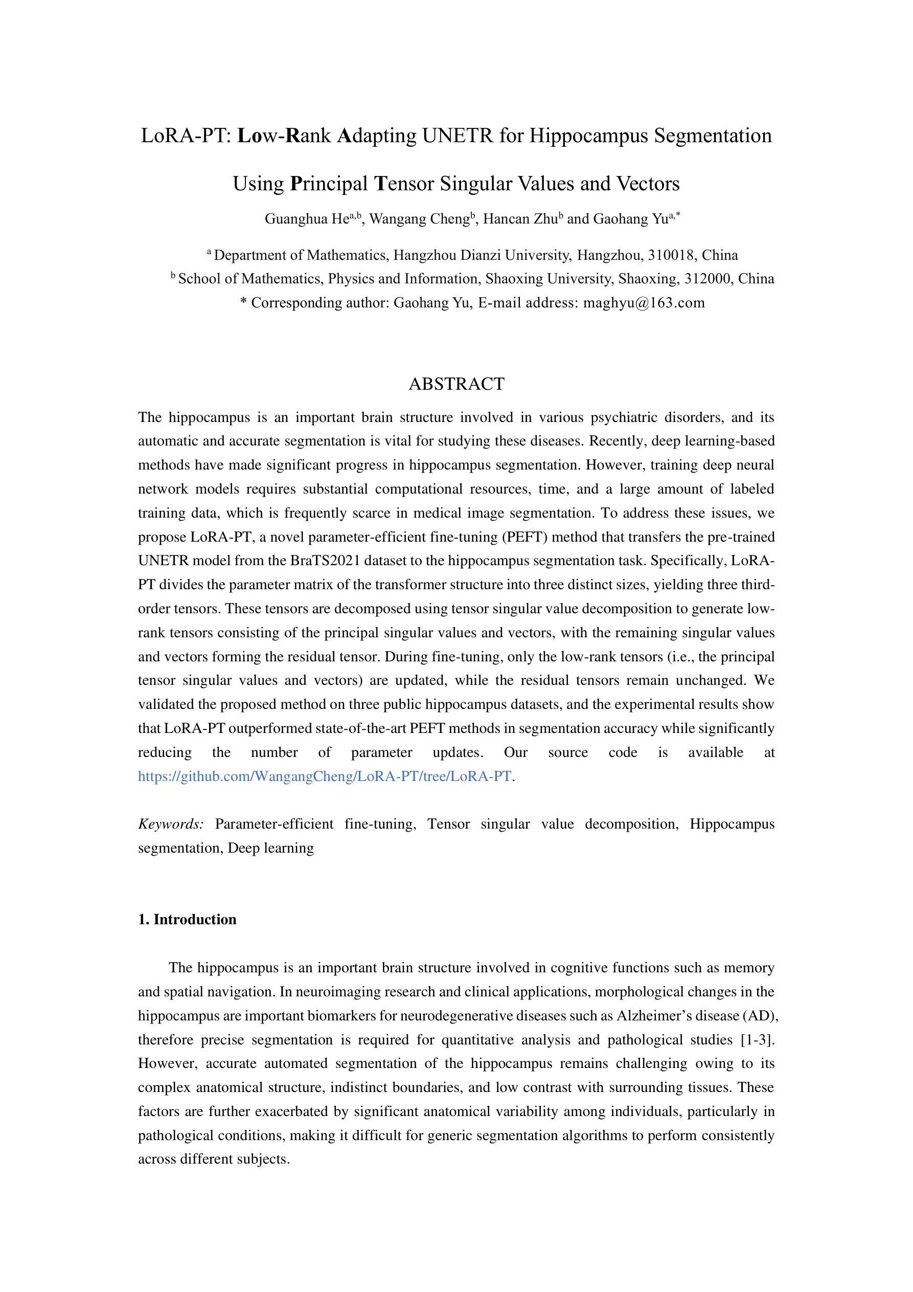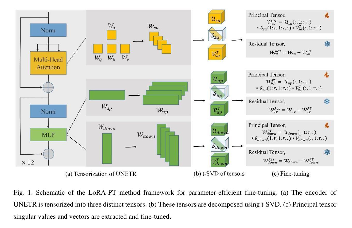 海马体是参与多种精神疾病的重要脑结构,其自动和准确的分割对于研究这些疾病至关重要。最近,基于深度学习的方法在海马体分割方面取得了显著进展。然而,训练深度神经网络模型需要大量的计算资源、时间和大量的标记训练数据,这在医学图像分割中经常是稀缺的。为了解决这些问题,我们提出了LoRA-PT,这是一种新型参数高效微调(PEFT)方法,它将BraTS2021数据集预训练的UNETR模型转移到海马体分割任务。具体来说,LoRA-PT将transformer结构的参数矩阵分成三种不同大小,产生三个三阶张量。这些张量通过张量奇异值分解进行分解,生成由主要奇异值和向量组成的低阶张量,其余的奇异值和向量形成残差张量。在微调过程中,只更新低阶张量(即主要张量的奇异值和向量),而残差张量保持不变。我们在三个公开的海马体数据集上验证了所提出的方法,实验结果表明,在分割精度上,LoRA-PT超越了最先进的PEFT方法,同时显著减少了参数更新的数量。我们的源代码可在https://github.com/WangangCheng/LoRA-PT/tree/LoRA-PT找到。