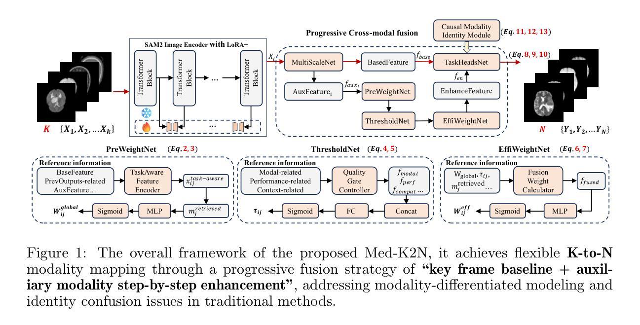 跨模态医学图像合成研究旨在利用现有成像模式重建缺失的成像模式,以支持临床诊断。受临床对灵活模态重建的需求驱动,我们探索了从K到N的医学图像生成方法,其中出现了三个关键挑战:我们如何建模不同模态对各项任务的异质贡献?我们如何确保融合质量控制,防止噪声信息的退化?我们如何在多输出生成中保持模态身份的一致性?受这些临床需求的驱动,并受到SAM2的顺序框架范式和临床医生逐步添加和选择性整合多模态信息的工作流程的启发,我们将多模态医学数据视为具有质量驱动选择机制的顺序帧。我们的核心思想是“学习”每个模态任务对的自适应权重,并通过逐步增强来“记忆”有益的融合模式。为此,我们设计了三个协作模块:用于全局贡献评估的PreWeightNet、用于自适应过滤的ThresholdNet、以及用于有效权重计算EffiWeightNet。同时,为了保持模态身份的一致性,我们提出了因果模态身份模块(CMIM),它使用视觉语言建模在生成的图像和目标模态描述之间建立因果约束。广泛的实验结果证明,我们提出的Med-K2N在多基准测试中显著优于最先进的方法。源代码已公开。