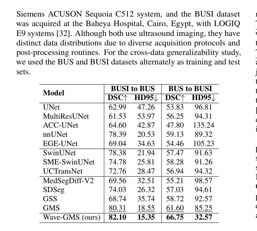 为了在医院和医疗保健设施中实现人工智能工具的公平部署,我们需要提供高性能的深度分割网络,它能够在具有有限内存和大批量数据的情况下,在成本效益高的GPU上进行训练。在这项工作中,我们提出了Wave-GMS,这是一种用于医学图像分割的轻量级、高效的多尺度生成模型。Wave-GMS具有大量的可训练参数,不需要加载内存密集型的预训练视觉基础模型,并且支持在具有有限内存的GPU上进行大批量训练。我们在四个公开可用数据集(BUS、BUSI、Kvasir-Instrument和HAM10000)上进行了大量实验,证明Wave-GMS达到了最先进的分割性能,具有出色的跨域泛化能力,同时只需要约2.6M的可训练参数。代码可在https://github.com/ATPLab-LUMS/Wave-GMS找到。