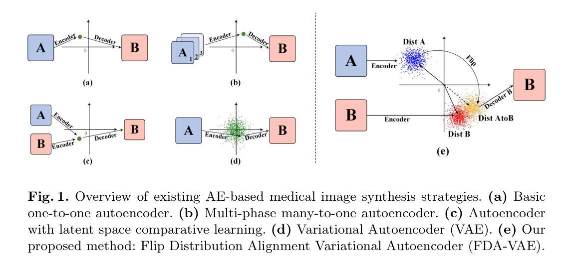 在多阶段增强(CE)MRI合成中,分离共享和独立特征至关重要。然而,现有方法使用参数效率较低的深度自编码器生成器,并且缺乏可解释的训练策略。在本文中,我们提出了Flip分布对齐变分自编码器(FDA-VAE),这是一种用于多阶段CE MRI合成的轻量级特征解耦VAE模型。我们的方法将输入图像和目标图像编码为两个潜在分布,这两个分布关于标准正态分布是对称的,从而有效地分离了共享和独立特征。Y形双向训练策略进一步增强了特征分离的可解释性。实验结果表明,与现有的基于深度自编码器的端到端合成方法相比,FDA-VAE在减少模型参数和推理时间的同时,有效地提高了合成质量。源代码公开在https://github.com/QianMuXiao/FDA-VAE。
