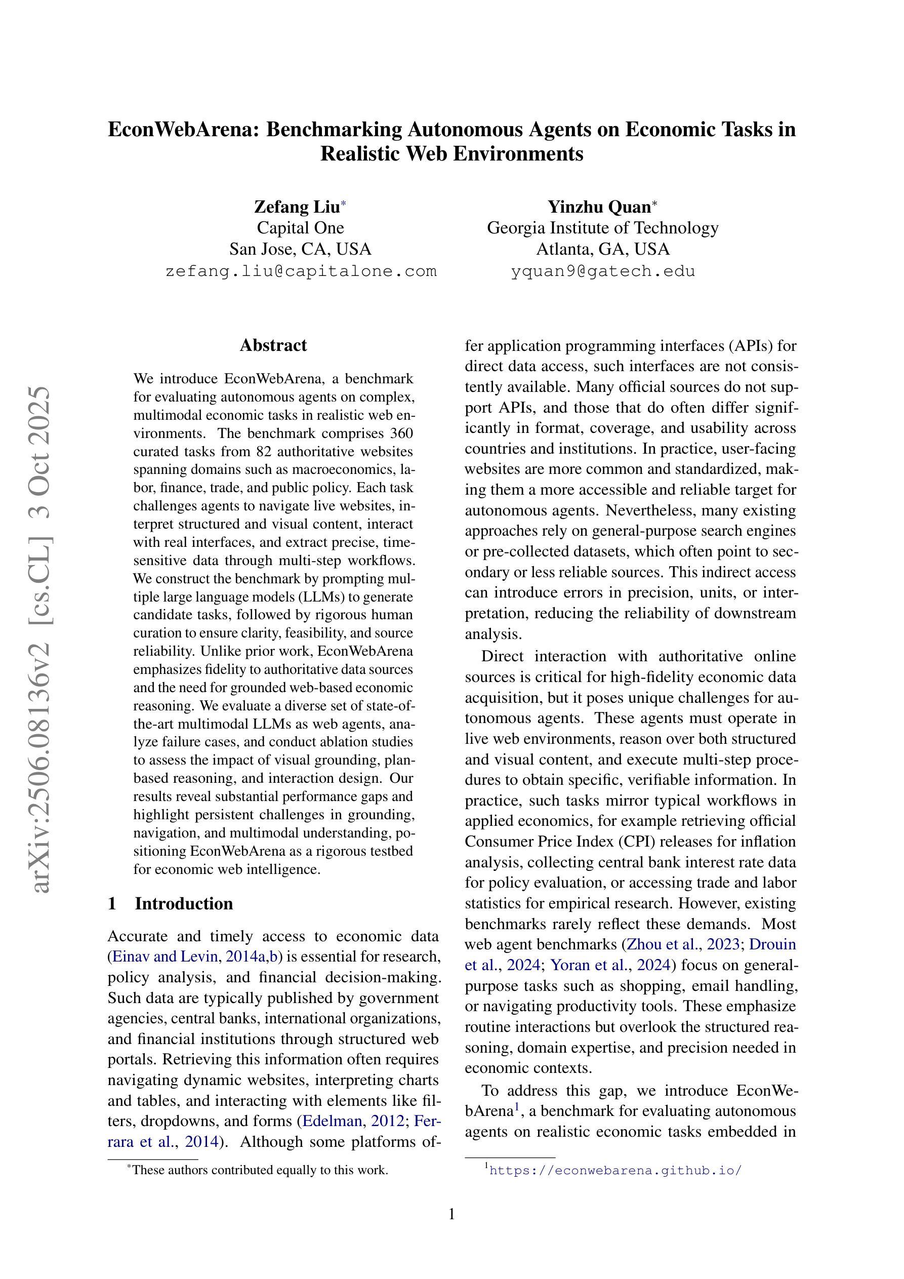 我们介绍了EconWebArena,这是一个在真实网络环境中评估自主代理在复杂、多模式经济任务上表现的标准。该标准包含来自82个权威网站的360个精心挑选的任务,涵盖宏观经济、劳动力、金融、贸易和公共政策等领域。每个任务都挑战代理在实时网站上导航、解释结构化和可视化内容、与真实界面进行交互,并通过多步骤工作流程提取精确且时间敏感的数据。我们通过提示多个大型语言模型(LLM)生成候选任务来构建这个标准,随后进行严格的人工筛选以确保清晰度、可行性和来源可靠性。与以前的工作不同,EconWebArena强调忠实于权威数据来源和基于网络的经济推理的需求。我们评估了一组先进的多模式LLM作为网络代理的表现,分析失败案例,并进行剔除研究以评估视觉定位、基于计划的推理和交互设计的影响。我们的结果揭示了巨大的性能差距,并强调了定位、导航和多模式理解方面的持续挑战,将EconWebArena定位为经济网络情报的严格测试平台。