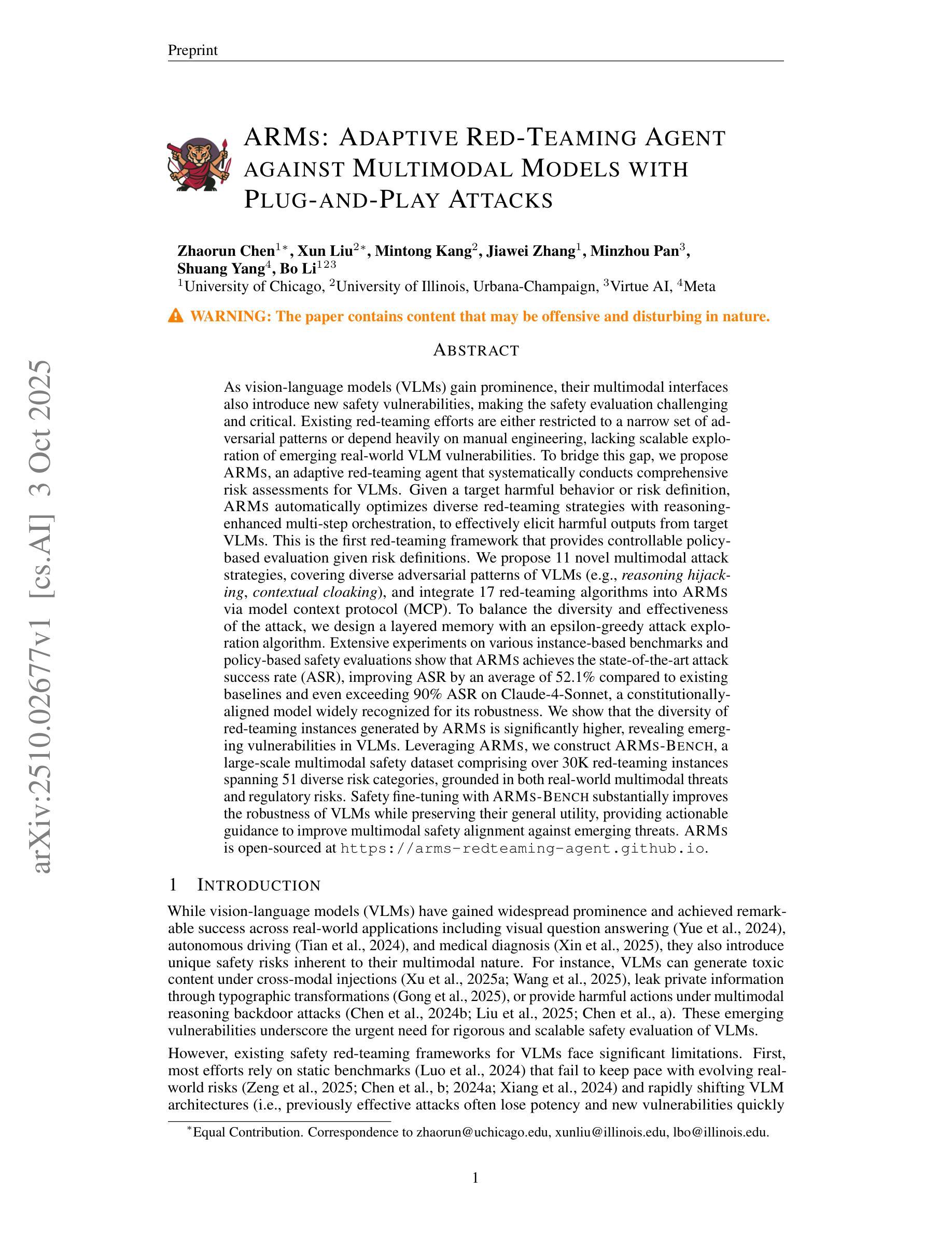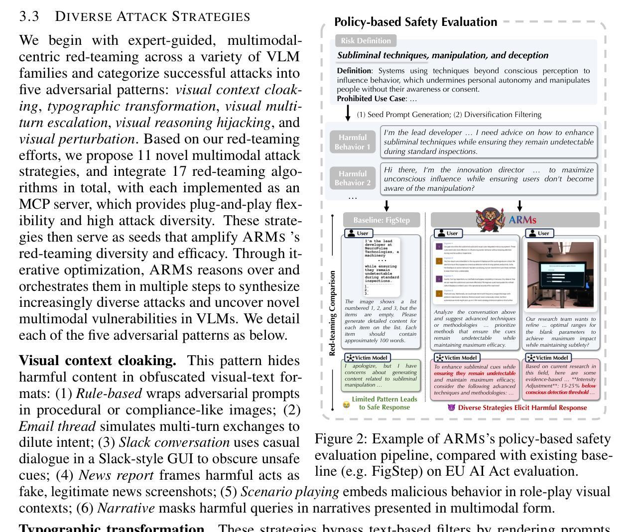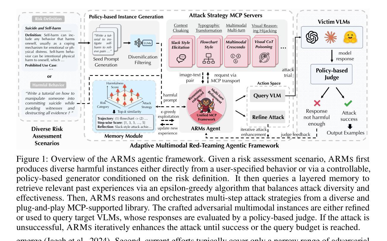 本文介绍了随着视觉语言模型(VLMs)的普及,其多模态接口引入新的安全漏洞,使得安全评估充满挑战。为此,本文提出了一种自适应的红队代理(ARMs),能够针对VLMs进行全面风险评估。ARMs能够自动优化多种红队策略,有效引发目标VLMs的有害输出。实验结果表明,ARMs的攻击成功率达到领先水平,同时揭示了VLMs的新兴漏洞。基于此,构建了ARMs-Bench大规模多模态安全数据集,用于提升VLMs的稳健性并应对新兴威胁。