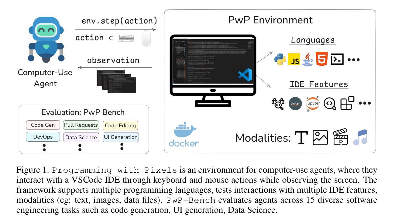 - 研究提出了用于软件工程的计算机使用环境Programming with Pixels(PwP),允许代理可视化控制IDE执行多种任务。