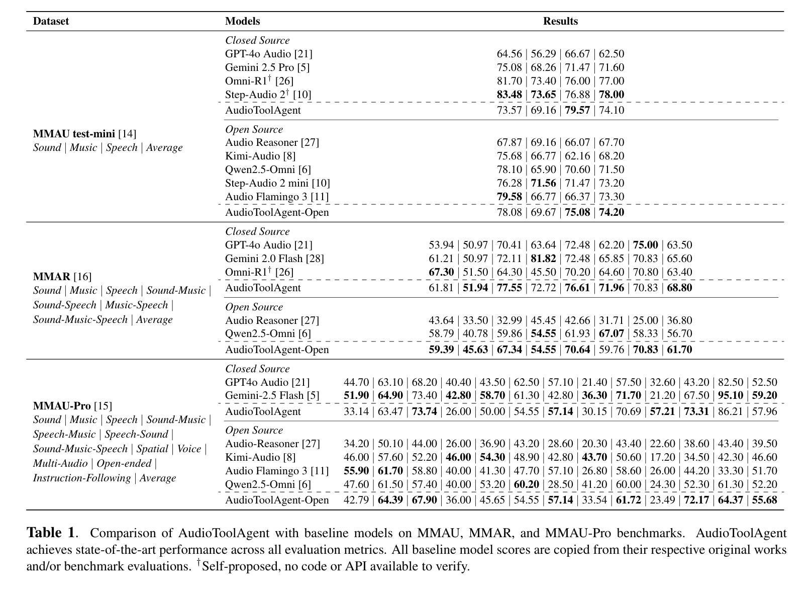 - 实验结果表明,AudioToolAgent在MMAU、MMAR和MMAU-Pro任务上达到了最先进的准确性,最高达到74.10%、68.80%和57.96%。