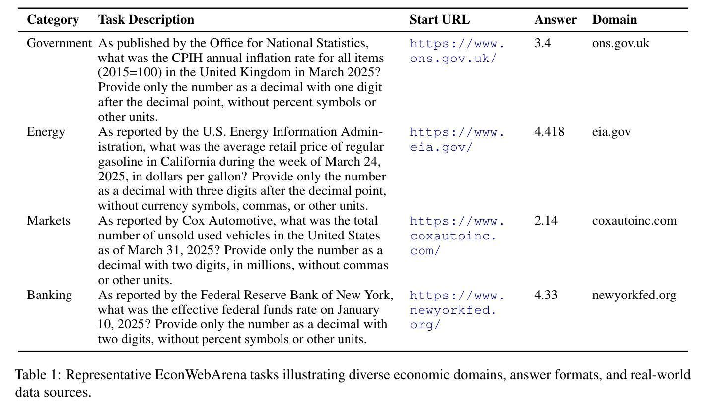 本文介绍了EconWebArena,这是一个用于评估现实网络环境中复杂多模式经济任务的自主代理性能的基准测试。该基准测试包含来自82个权威网站的360个精选任务,涵盖宏观经济、劳动、金融、贸易和公共政策等领域。EconWebArena强调对权威数据源的忠实性和基于网络的经济推理需求。文章评估了多种先进的多模式大型语言模型作为网络代理的性能,分析了失败情况,并通过废除研究评估了视觉定位、基于计划的推理和交互设计的影响。研究结果显示出巨大的性能差距,并指出了定位、导航和多模式理解方面的持续挑战,将EconWebArena定位为经济网络情报的严格测试平台。