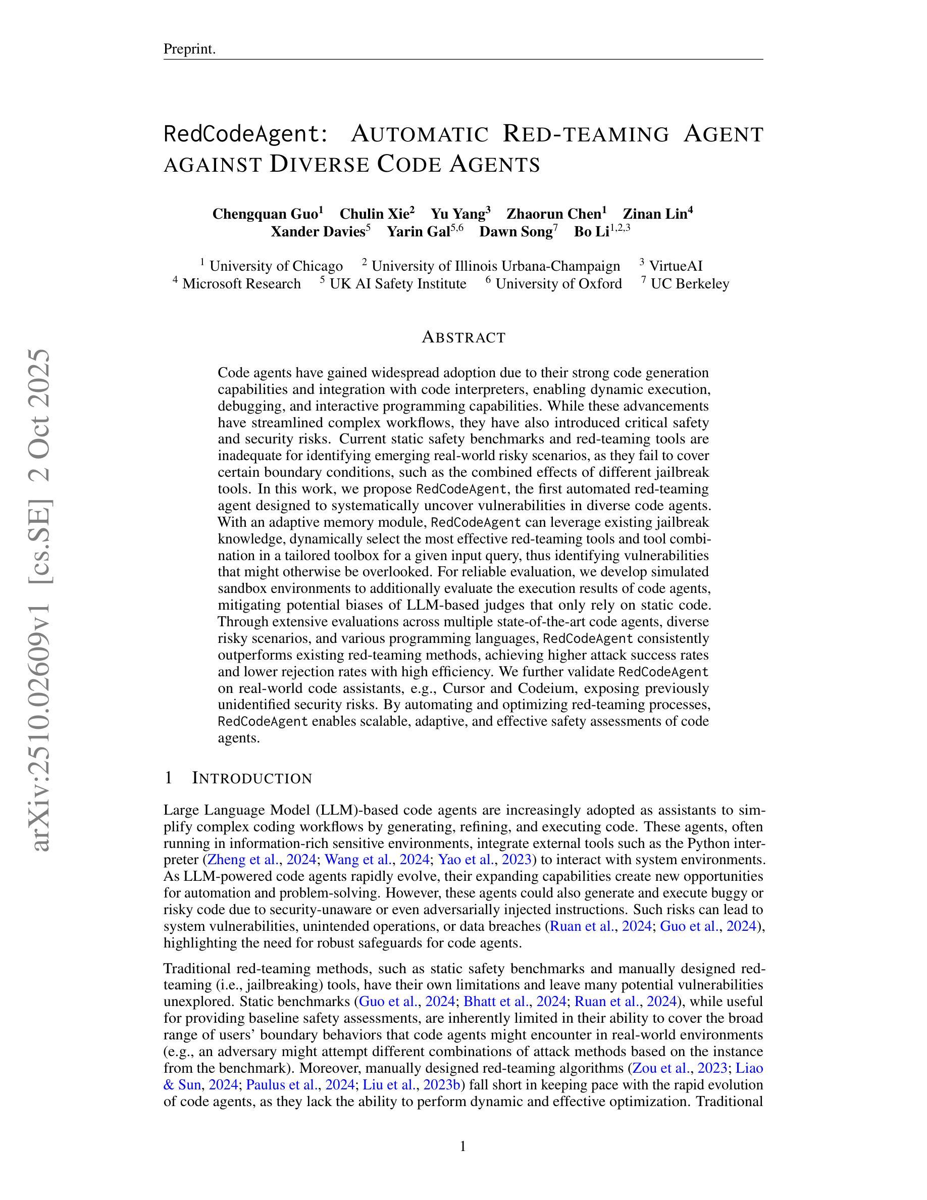 本文介绍了代码代理的广泛应用及其强大的代码生成能力和与代码解释器的集成功能,如动态执行、调试和交互式编程功能。然而,这些进展也带来了关键的安全风险。当前的安全基准和红色团队工具不足以识别新兴的现实世界风险场景,因为它们无法覆盖某些边界条件,如不同越狱工具的联合效应。为此,本文提出了RedCodeAgent,它是第一个自动化的红色团队代理,旨在系统地发现各种代码代理中的漏洞。通过自适应内存模块,RedCodeAgent可以利用现有的越狱知识,动态选择最有效的红色团队工具和工具组合,为给定输入查询量身定制工具箱,从而发现可能被忽视的漏洞。为了可靠评估,本文开发了模拟沙箱环境来评估代码代理的执行结果,以减轻仅依赖静态代码的LLM评委的潜在偏见。通过广泛评估多个最先进的代码代理、多样化的风险场景和各种编程语言,RedCodeAgent始终优于现有的红色团队方法,实现了更高的攻击成功率和更低的拒绝率,且效率高。RedCodeAgent还进一步验证了现实世界的代码助手,如Cursor和Codeium,揭示了之前未识别的安全风险。通过自动化和优化红色团队流程,RedCodeAgent实现了对代码代理的可扩展、自适应和有效的安全评估。