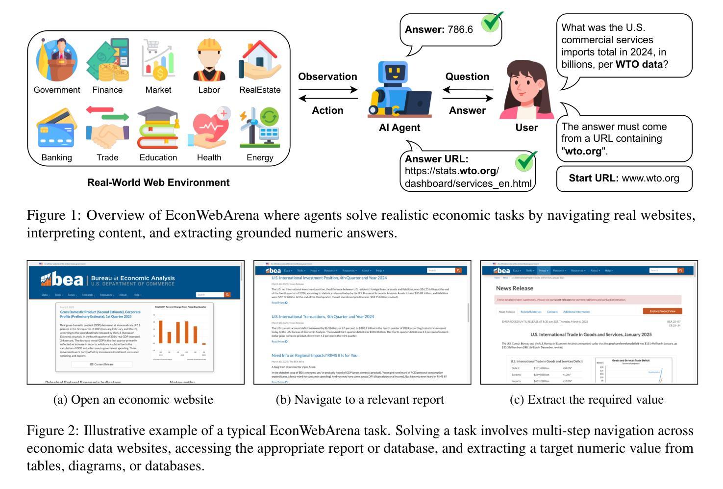我们介绍了EconWebArena,这是一个在真实网络环境中评估自主代理在复杂、多模式经济任务上表现的标准。该标准包含来自82个权威网站的360个精心挑选的任务,涵盖宏观经济、劳动力、金融、贸易和公共政策等领域。每个任务都挑战代理在实时网站上导航、解释结构化和可视化内容、与真实界面进行交互,并通过多步骤工作流程提取精确且时间敏感的数据。我们通过提示多个大型语言模型(LLM)生成候选任务来构建这个标准,随后进行严格的人工筛选以确保清晰度、可行性和来源可靠性。与以前的工作不同,EconWebArena强调忠实于权威数据来源和基于网络的经济推理的需求。我们评估了一组先进的多模式LLM作为网络代理的表现,分析失败案例,并进行剔除研究以评估视觉定位、基于计划的推理和交互设计的影响。我们的结果揭示了巨大的性能差距,并强调了定位、导航和多模式理解方面的持续挑战,将EconWebArena定位为经济网络情报的严格测试平台。