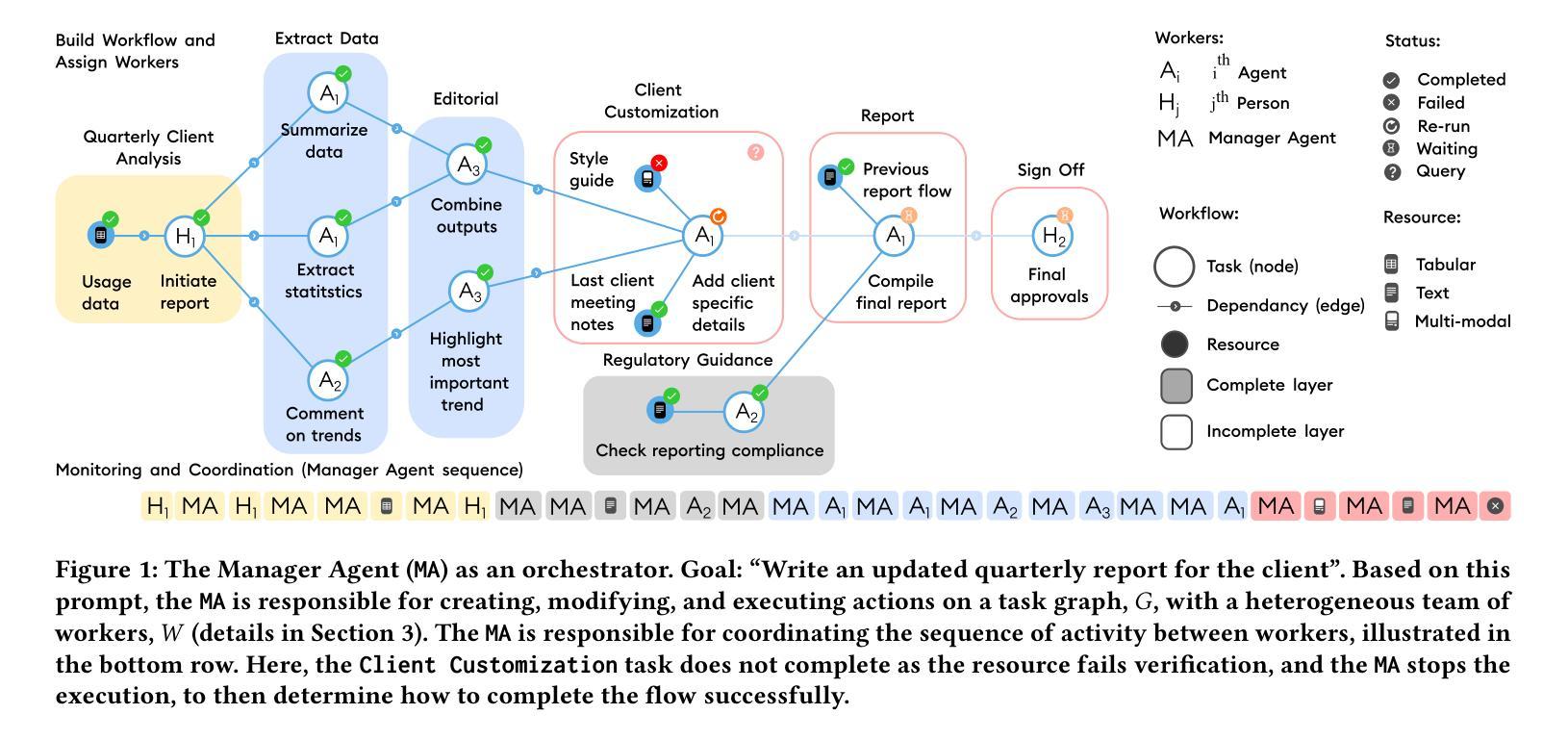 虽然代理智能AI在自动化单个任务方面取得了进展,但管理复杂的多代理工作流程仍然是一个具有挑战性的问题。本文旨在为在动态人机团队中协调合作的自主代理系统提供研究愿景。我们提出“自主管理代理”作为核心挑战:该代理能够将复杂目标分解为任务图,分配给人类和AI工作者,监控进度,适应变化条件,并保持透明的利益相关者沟通。我们将工作流程管理形式化为部分可观察的随机游戏,并确定了四个基本挑战:(1)层次分解的组合推理,(2)变化偏好下的多目标优化,(3)临时团队的协调和规划,以及(4)设计和遵守治理规则。为了推进这一议程,我们发布了MA-Gym,这是一个用于多代理工作流程编排的开源模拟和评估框架。在20个工作流程中评估基于GPT-5的管理代理,我们发现他们在目标完成、约束遵守和流程运行时间方面的联合优化存在困难,这突显出工作流程管理是一个困难的开放性问题。最后,我们探讨了自主管理系统对组织和伦理的影响。