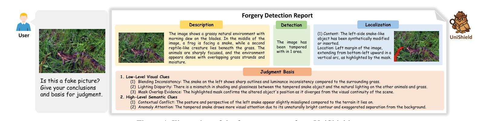随着图像生成技术的快速发展,合成图像越来越逼真,给社会带来了重大风险,如虚假信息和欺诈。因此,图像伪造检测与定位(FIDL)对于维护信息完整性和社会安全至关重要。尽管现有的特定领域检测方法表现出令人印象深刻的性能,但由于其专业化范围狭窄、跨域泛化能力较差以及缺乏集成自适应框架,其实践适用性仍然有限。为了解决这些问题,我们提出了UniShield,这是一种新型的多智能体统一系统,能够检测和定位不同领域的图像伪造,包括图像操纵、文档操纵、深度伪造和人工智能生成的图像。UniShield创新地将感知智能体与检测智能体相结合。感知智能体能智能地分析图像特征以动态选择适当的检测模型,而检测智能体则将各种专业检测器整合到一个统一框架中,并生成可解释的报告。大量实验表明,UniShield达到了最先进的水平,超过了现有的统一方法和特定领域检测器,突显了其卓越的实践适用性、适应性和可扩展性。