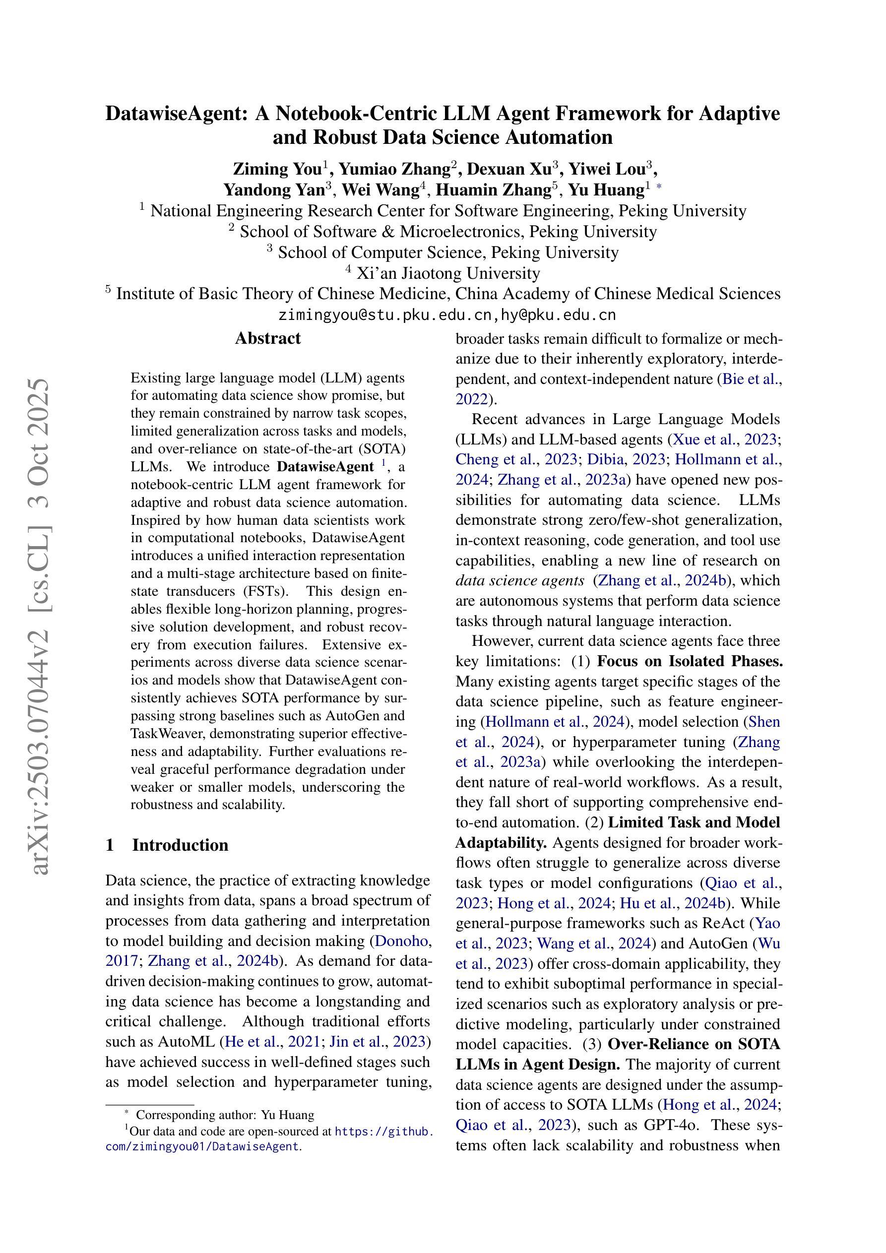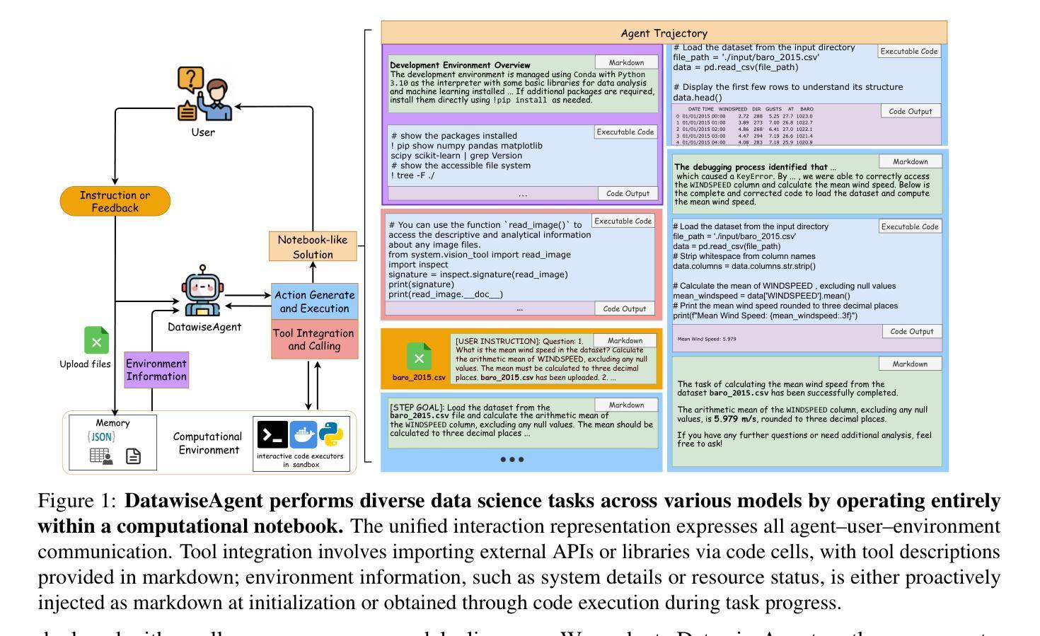 DatawiseAgent是一个针对自适应和稳健数据科学自动化的笔记本中心化的大型语言模型(LLM)代理框架。它通过引入统一的交互表示和多阶段架构,实现了灵活的长周期规划、渐进的解决方案开发和从执行故障中的稳健恢复。它在多样化的数据科学场景和模型中的实验表现优秀,超越了AutoGen和TaskWeaver等强基线,显示出优越的有效性和适应性。即使在较弱或较小的模型下,也能保持优雅的降级性能,突显了其稳健性和可扩展性。